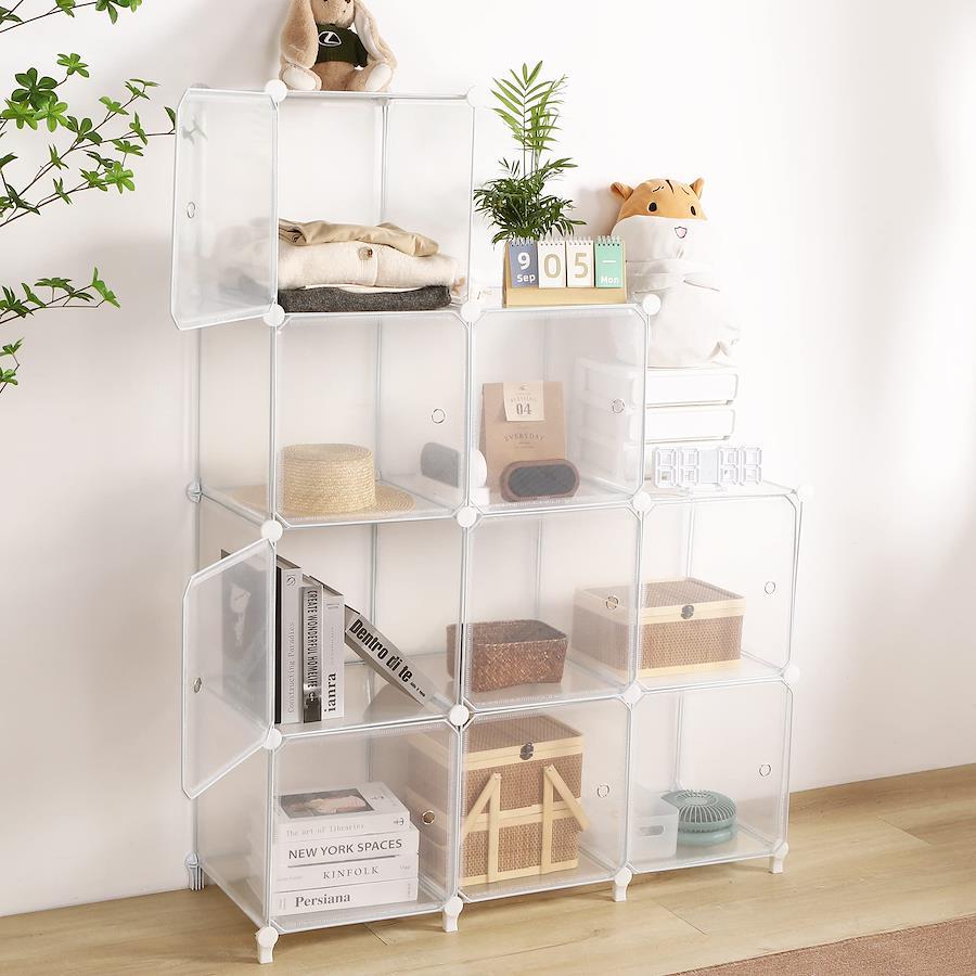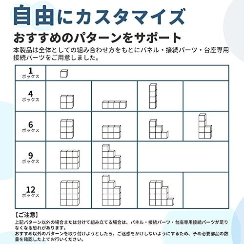 【大容量で収納もレイアウトもスマートに】収納ボックス1個あたりサイズ:W35×D35×H35cm。棚板を支えるフレームは頑丈なスチール製収納棚で、1ラックあたりの耐荷重は3.5kg まで耐えられる。お洋服、バッグ、靴、ファイル、生活用品、趣味道具の収納から、おもちゃ、フィギュアなどのディスプレイラックまで活躍。 【スペース?用途に合わせて自由にカスタマイズ】画像のように複数のおすすめパターンをサポート。用途に合わせて多様な収納スペースに対応することができ、コーディネートの楽しみが広がる。 【しっかりとした作り ドア付きの防塵構造】●扉付き収納棚でホコリが入りにくい。●棚板:環境に優しく、耐久性にも優れたPP材質で、お子様がいるご家庭でもお使いいただける。●フレーム:頑丈なスチール製で、棚板をガッチリ支えてかなり安定感がある。●連結パーツ:高品質ABS樹脂製で、強度と耐衝撃性を両立。 【差し込むだけの簡単組み立て】ブロックのようなシンプルな収納棚で、接続パーツにフレームをはめ込むだけの簡単な組み立て。ネジなどの工具は一切不要。 【軽くて移動や解体もラクラク】重量は1ボックスあたり1kgと軽量なので、一人暮らしや単身赴任など、短期の滞在時もすぐに使える収納ラック。模様替えや引っ越しや使わなくなった際は分解してしまえるのでお部屋からの運び出しも楽々。