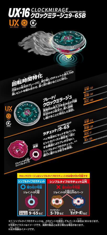 【UX-16】3色の「クロックミラージュ9-65B」の中からいずれか1個が入っているランダムブースター。 「クロックミラージュ9-65B 」は円形60枚刃のブレードに、背の低いラチェットと持久力の高いビットを組み合わせ、長く回り続けることに特化しているベイ 【UX-16】ブレード(1)、ラチェット(1)、ビット(1)、取扱説明書(1)、ベイコードカード(1) W90×H152×D50mm 4904810990154