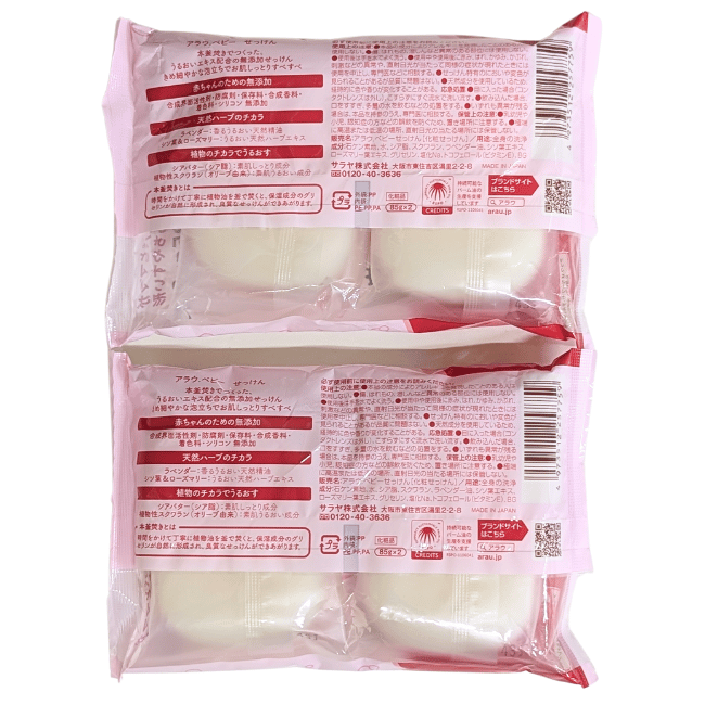 きめ細やかな泡立ちで、赤ちゃんをやさしくしっとりと洗い上げます。 ママに持ちやすく泡立てやすい形で、お値段そのままのうれしい2個パック。 デリケートな赤ちゃんの肌をいたわる保湿成分として「シアバター&スクワラン」を配合しました。※植物油を釜焚きしていく過程で天然保湿成分"グリセリン"を自然な形で含むため、素肌がつっぱりにくい、しっとりとした良質なせっけんができあがります。「アラウ.ベビーせっけん」は、高純度に精製された植物性油脂を100%使用し、この方法でつくられた無添加せっけんをベースに、天然ハーブをプラスしてつくられています。