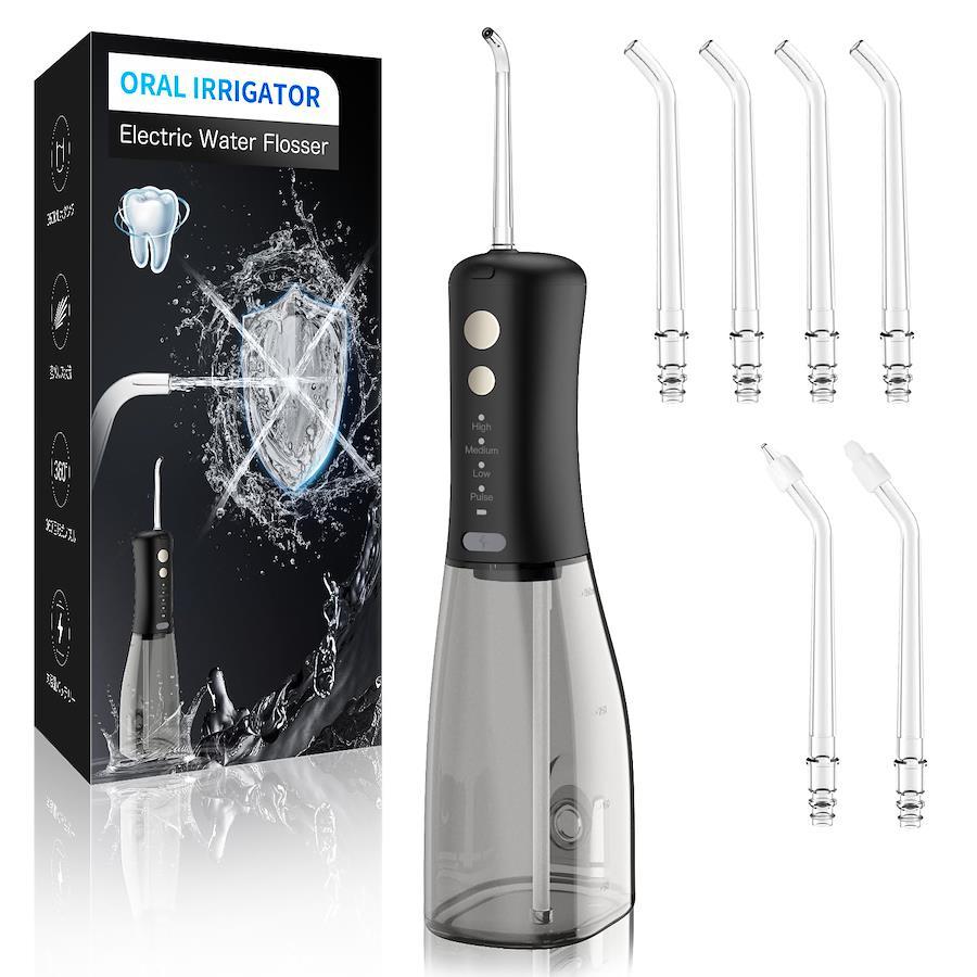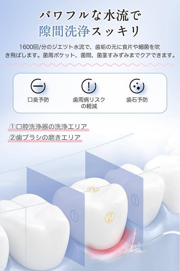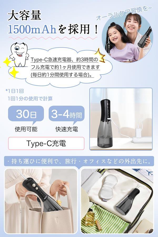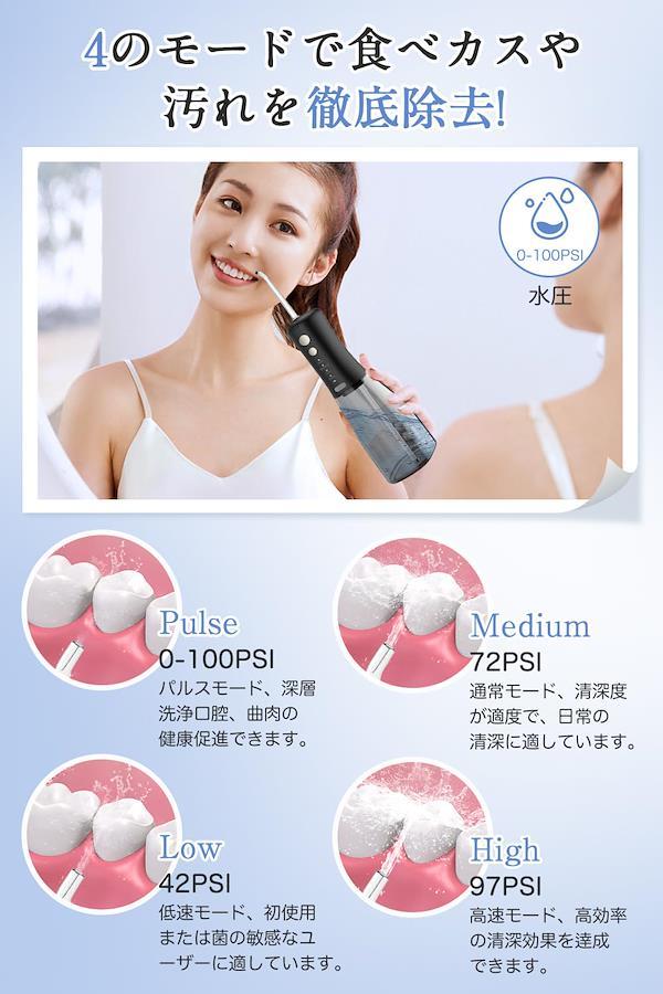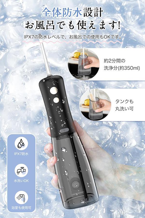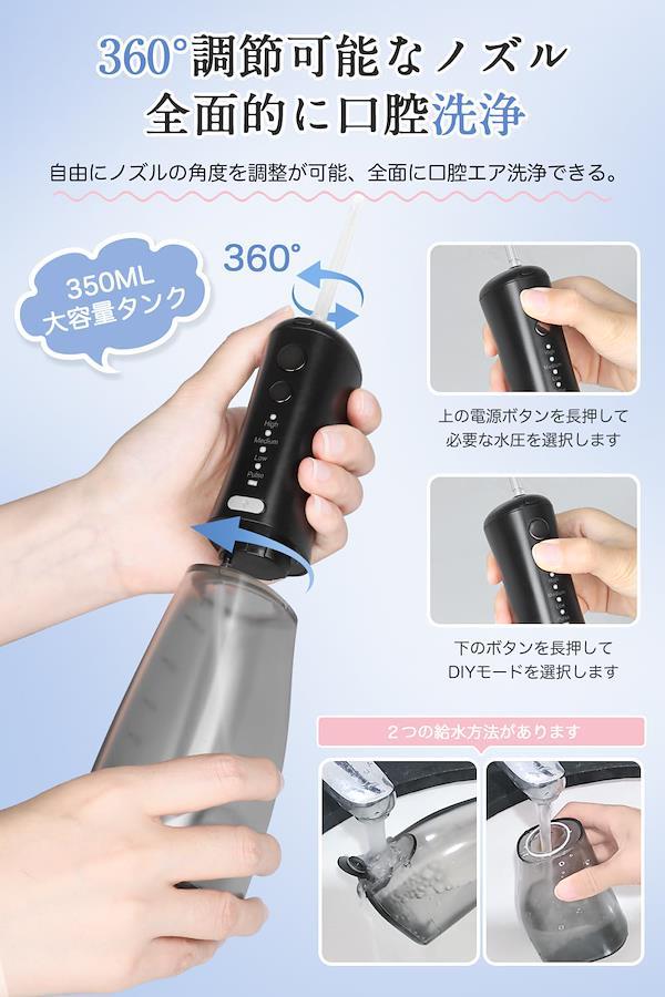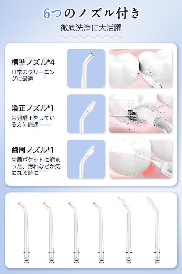 ??【パワフルな水流・洗浄力抜群】最新改良型口腔洗浄器は高圧とパルス流技術を組み合わせて、伝統的な鹵プラシでは到達できなかった鹵と歯肉の間の領域を清潔にすることができ、効果的に歯の上の食べ物の残りかすや細菌ウイルス、頑固な汚れを取り除き、口の中を清潔にします。それによって良好なロ腔衛生を実現することができます。歯並びが乱れていたり、掃除がしにくい場合でも、細かいノズルで奥歯の汚れをしっかり落とします。徹底的に口の中を清潔にすることができます。 ??【4段階の水流モード・3種ノズル6本】水流の強さを選べる4つの水流モードが搭載されています(高速モ一ド、通常モ一ド、低速モ一ド、パルスモ一ド)。歯のさまざまな部分での精密なクリーニングに使用でき、お好みのクリーニングモードをお選びいただけます。ご注意:初心者、子供、歯茎が弱い方は低速モ一ド「Low」をお勧めします。口腔洗浄器は3種、6ノズルが付属します。4つの標準ノズルを含んで、日常のクリーニングに適して、歯周袋ノズルは歯周炎、歯肉炎の人に適しており、柔らかい水の流れを歯袋まで深く洗浄し、炎症を緩和することができて、矯正ノズルは歯列矯正期、歯套を装着する人達に適しています。そのブラシ毛は矯正後の歯カフ、歯冠、歯橋、植歯周囲に対して設計されています。ノズルが360度に回転できる設計され、あらゆる角度で徹底的なクリーニングをします。 ??【大容量バッテリー・持ち運びやすい】1500mAh大容量の電池内蔵ですので、長時間使用することができます。バッテリーの寿命も延長できます。USB充電式で、いつでもご利用いただける歯ジェットウォッシャーです。持ち運びタイプで、マンションやアパートのコンパクトな洗面所で使用しても、据え置きタイプと違って邪魔になりません。 ??【350MLタンク・IPX7防水】350mlの水タンクは簡単に口腔洗浄器から取り外したり取り付けたりします。簡単に注水&使用後にも清潔に保て、お手入れも簡単です。IPX7の防水設計を内部・外部に採用。人間工学デザインにより、洗浄器をどの角度で持っても、疲労感もあまり感じなく、スムーズに水を噴射することができます。接合部のゴム製ガスケットにより、本体からの水漏れを防止します。(※充電口のカバーを完全に装着してください。) ??【ご注意事項・1年間保証】①本製品を使用する前に、3-4時間充電して、十分な電力量を確保してください。②充電パネルが水に入らないようにしましょう、水を入れるか掃除するときに充電口のカバーを完全に装着してください。③ノズルコネクタから水が漏れている場合は、ノズルが取り付けられているかどうかを確認します。ノズルリリーズボタンを長押ししてからノズルを取り付けてみてください。※本製品を安全にお使いいただくために、製品をお使いになる前には、必ず取扱説明書をお読みください。製品は1年間品質保証期間が付いてるので、もし使用中に何かの問題がありましたあら、是非お気軽にお問い合わせください。