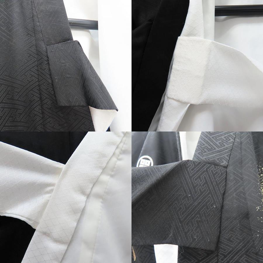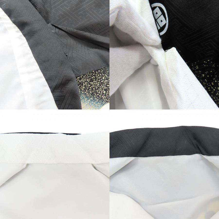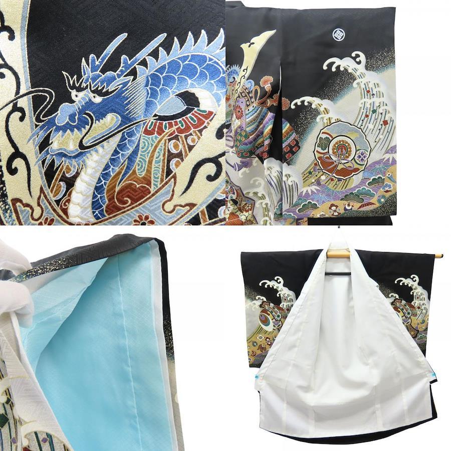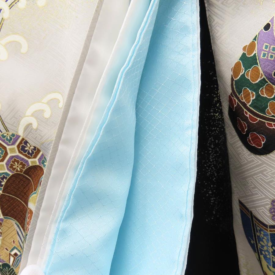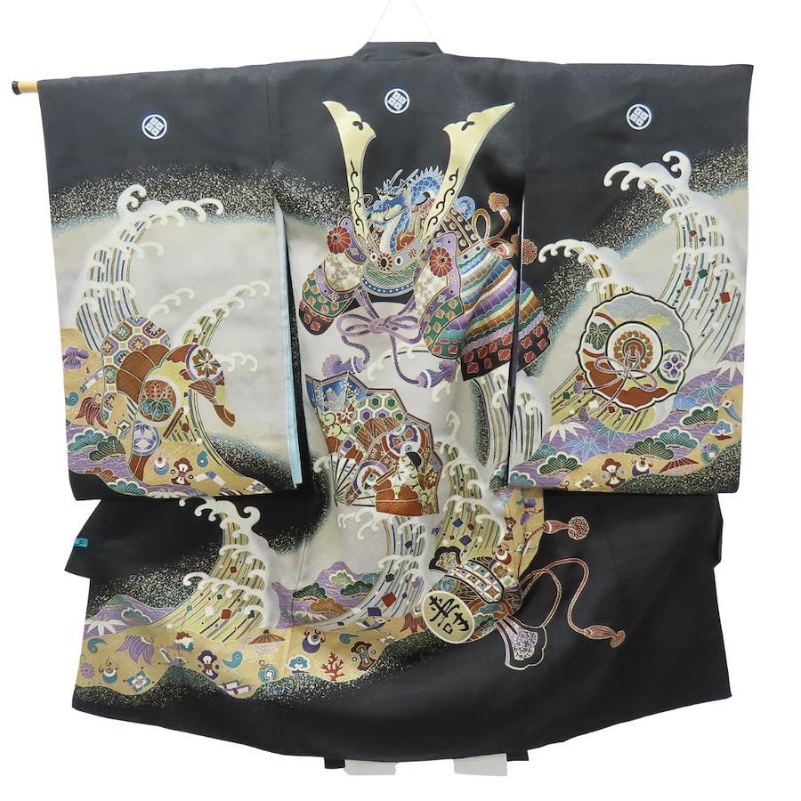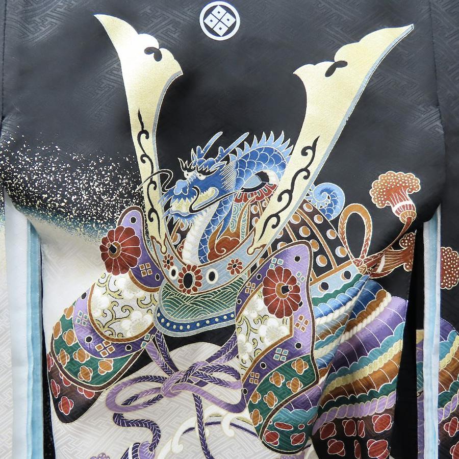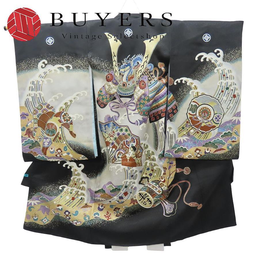| 品名 | 【中古】 子供着物 祝着 正絹(金銀糸除く) 化学繊維 ブラック グレー マルチカラー 襦袢付き 男の子用 兜柄 |