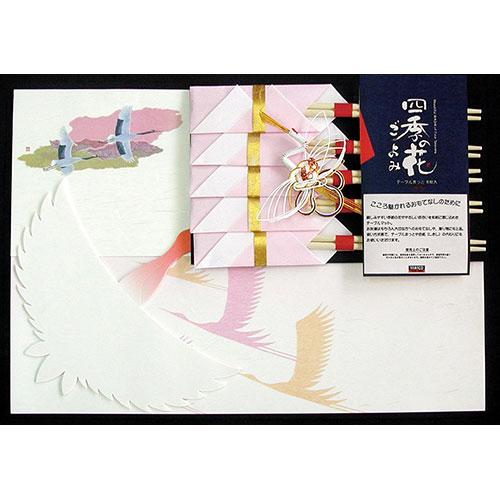 はんなりとかわいらしく…。花々が敷き紙を飾る、おもてなしシリーズ。ほんのりとした色合いが、お料理や器を引きたてます。お正月やハレの日の食卓に。お祝いにぴったりの「鶴づくし」セットです。