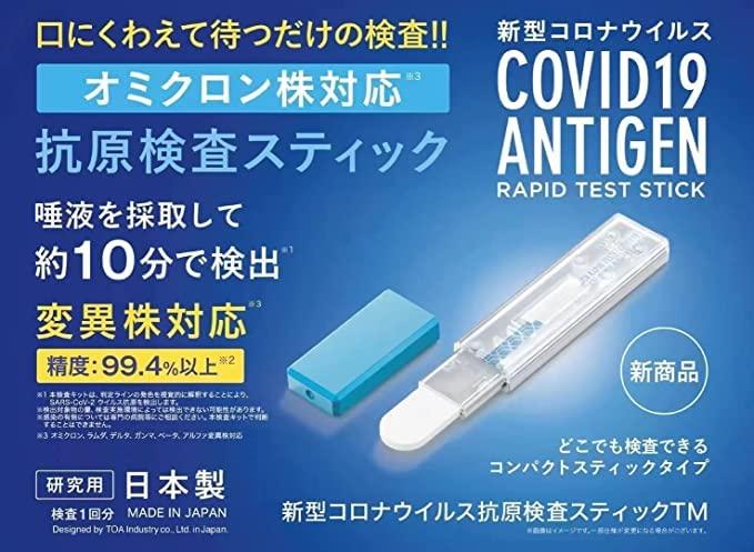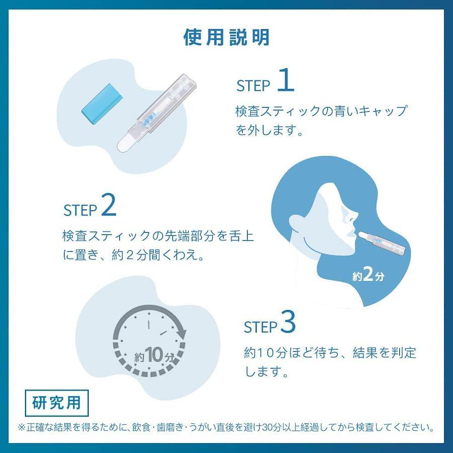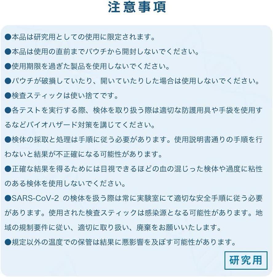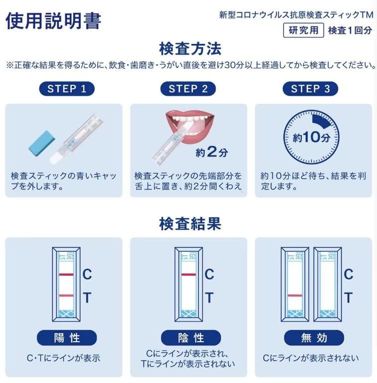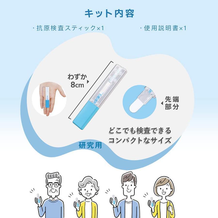 ●このキットは疫学調査や試験研究向け、新型コロナウイルス感染症の診断用ではない。その使用は病気の診断ではなく研究目的に限られます。 ●疑われる症状がある場合は、必ず受診相談センターや医療機関にご相談ください。自己判断での使用はお控えください。 ●新型コロナウイルス検査を希望する無症状の方は、自己負担の自費検査を提供する医療機関へご相談ください。 ●使用方法:キャップを外し舌の上に置くだけの簡単操作。10分待つと結果が出ます。必ず飲食・歯磨き・うがい直後30分以上経ってから検査してください。 ●商品仕様:検査スティック×1、乾燥剤×1、使用説明書×1 含みます。安全に使用するため、必ず説明書をお読みください。