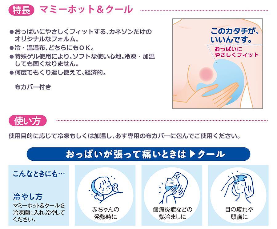 【ご使用方法】使用目的に応じて冷凍もしくは加温し、必ず専用の布カバーに包んでご使用ください。◎乳房が張りすぎて痛い時は冷やして使います。マミーホット&クールを冷凍庫に入れ、冷やしてください。母乳の分泌量を少し抑えるために、冷湿布としてお使いください。乳腺炎などの炎症の軽減にもご使用いただけます。乳房にあてるか、ブラジャーに挟んでご使用ください。また、赤ちゃんの発熱時や歯痛炎症などの熱さまし、目の疲れや頭痛時にも便利です。◎血行を良くしたいときは温めて使います。沸騰させて火を止めたお湯の中に、マミーホット&クールを約5分間浸けて温めてください。腰や肩が冷えたり痛むときは、血液の循環を良くするために、温湿布としてお使いください。また、腰の痛みや冷えや肩こりの血行促進、関節痛などにもお使いいただけます。