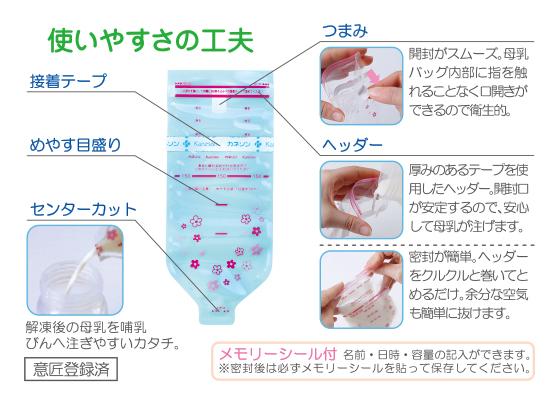 【ご使用方法】新生児は細菌に対して抵抗力が弱いので、お取り扱いは清潔にお願いします。手指を石けんでよく洗ってから母乳バッグを取り扱ってください。①上部の透明部分の切り込み口をヘッダーにそって引き裂きます。※ヘッダーをはがさないでください。②ヘッダーの中央部を白いつまみ側に折り目を付けてから、ヘッダーの両端を持ちます。③白いつまみを手前に引っ張り、母乳バッグの口を開けます。※母乳バッグ内に指を入れたり、息を吹き込んだりしないでください。④ヘッダーの両端を持ちながらもう一方の手で母乳バッグの下部を引っ張り、底まで広げてください。⑤片手でヘッダーの両端を持ち母乳バッグの口を開けたままコップの中で受けて、母乳をゆっくり注いでください。※最大容量表示のライン以上入れないようにしてください。破れや漏れの原因となります。(めやす目盛りは、白いつまみを持って自然にたまった状態での表示ですが、あくまでめやすですので正確ではありません。)⑥母乳バッグの空気を抜き、ヘッダー部分を接着テープにむかって手前に3回巻き込みます。(※25mlの場合は2回巻き込みます。)つぎに接着テープ部分のはくり紙をはがし、さらに1回巻き込み、しっかり押さえてとめてください。⑦あらかじめ名前とさく乳日時、容量を記入しておいたメモリーシールを⑥でしっかり押さえとめた部分の上にしっかりと貼ってください。そして速やかに冷凍庫(冷蔵庫)で保存してください。※冷凍庫で保存する場合は、母乳バッグ表面の水滴をよく拭き取り、1個ずつラップやポリ袋に包んでください。(庫内にくっつき取り出せなくなったり、冷凍庫内の他の食品類とくっついてしまい、フィルム外側のナイロン層がはがれてしまうことがあります)
