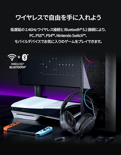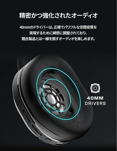 低遅延 2.4GHz ワイヤレス + Bluetooth 5.2 接続 最大 40 時間持続する最高クラスのバッテリー Bluetooth にシームレスに切り替えられる QuickSwitch ボタン 超軽量のフローティングヘッドバンドとメモリーフォームイヤークッション 40mm ドライバーにより強化されたパワフルな空間オーディオ