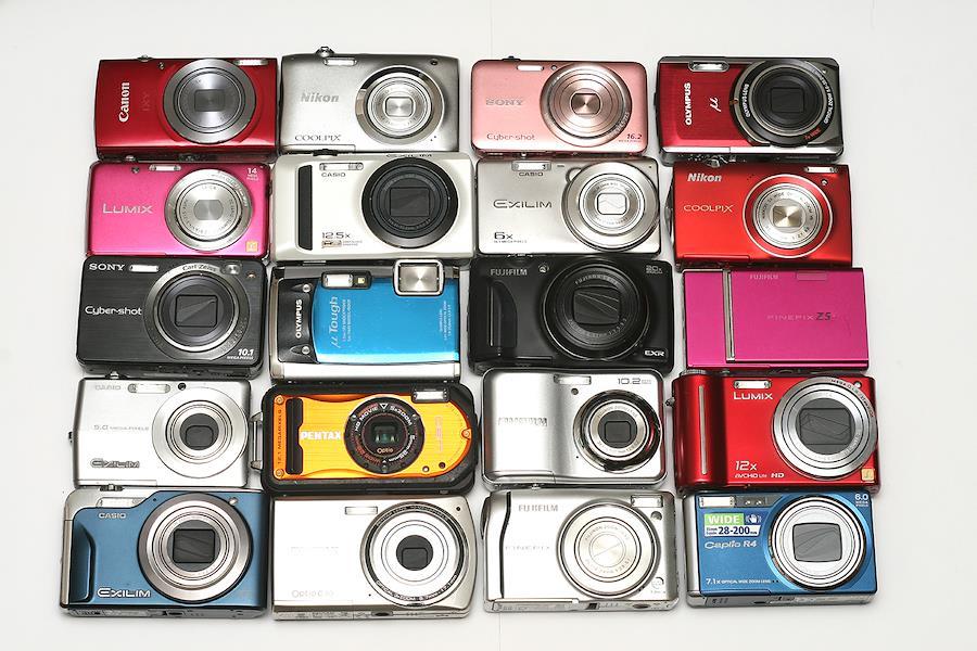 ■ Brand Lineup includes: Canon, Sony, Pentax, Nikon, Olympus, Fujifilm, Casio, and Panasonic (Lumix). Includes popular models like the PENTAX Optio (Orange) and OLYMPUS Tough (Blue).