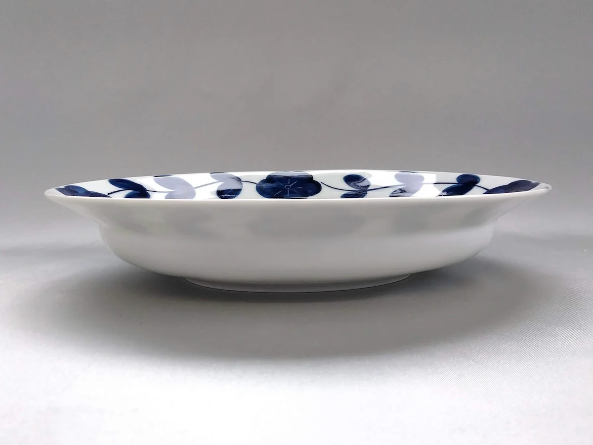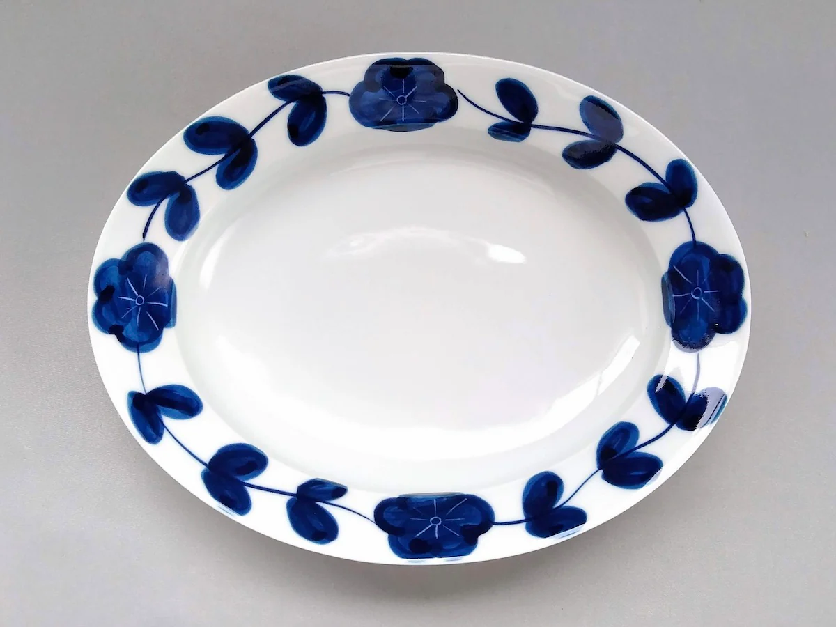 【One-of-a-kind Japanese Artisanal Handcrafted Piece】 Rim Oval Plate with Underglazed Flowers - Crafted By Koyo Kiln