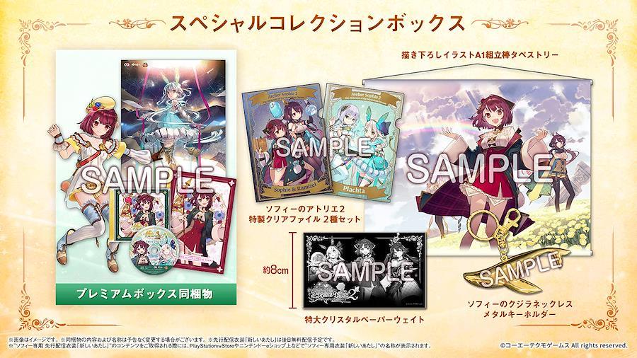 同梱内容1、ゲームソフト2、ソフィー専用 先行配信衣装「新しいあたし」ダウンロードシリアル3、ソフィーのアトリエ2 エクストラトラックス4、ソフィーのアトリエ2 ビジュアルブック5、描き下ろしイラストB3布ポスター6、ソフィーのアトリエ2 特製クリアファイル2種セット7、特大クリスタルペーパーウェイト8、ソフィーのクジラネックレスメタルキーホルダー9、描き下ろしイラスト A1組立棒タペストリー※スペシャルコレクションボックスの同梱物の内容および名称は予告なく変更する場合がございます。