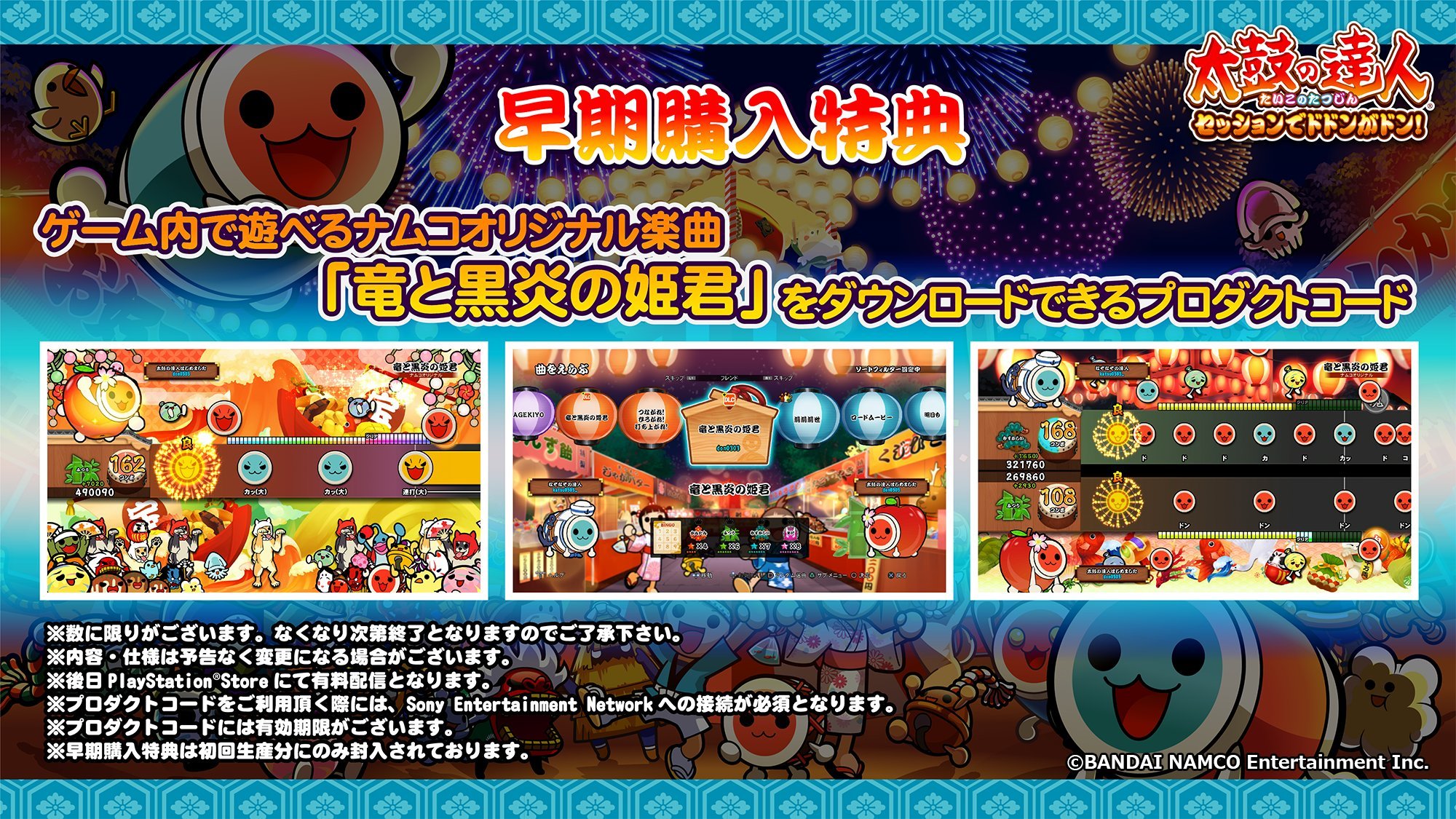 【注意表記】 *数に限りがございます。なくなり次第終了となりますのでご了承下さい。 *内容・仕様は予告なく変更になる場合がございます。 *プロダクトコードをご利用頂く際には、Sony Entertainment Networkへの接続が必須となります。 *プロダクトコードには有効期限がございます。 *早期購入特典は初回生産分にのみ封入されております。 *早期購入特典のナムコオリジナル楽曲「竜と黒炎の姫君」は後日PlayStation (R) Storeにて有料配信となります。