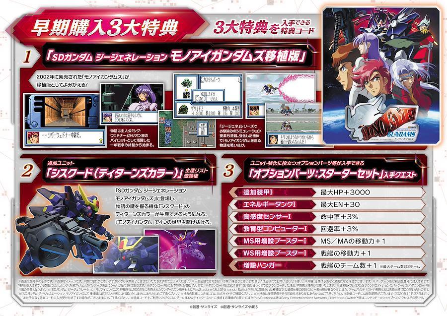 ■3大特典を入手できる特典コード ・「SDガンダム ジージェネレーション モノアイガンダムズ」移植版 ・追加ユニット「シスクード(ティターンズカラー)」生産リスト登録権 ┗「シスクード(ティターンズカラー)」が生産リストに登録、生産できるようになる。 ・「オプションパーツ:スターターセット」が入手できるクエスト ┗ゲーム開始時に役立つオプションパーツ等が入手できる。