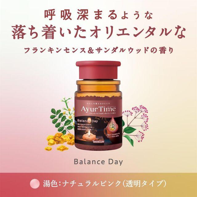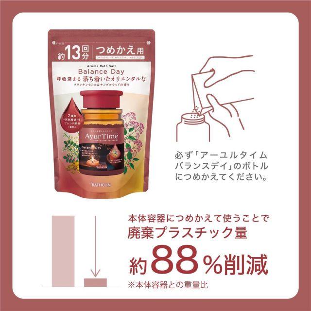 商品紹介●わたしを整える、心地良い時間。奥深く繊細な香りのバスソルトです。●天然由来成分95%以上配合。原材料・成分塩、香料、シリカ、グルタミン酸Na、オニイチゴ根エキス、ゴマ種子油、ネオペンタン酸イソデシル、ケイ酸Ca、BG、水、PEG-8、黄5、赤227使用方法ボトルへのつめかえ方つめかえ時には以下の事項をお守りください。●必ずアーユルタイムバランスデイのボトルにつめかえてください。●本体の商品を、すべて使い切ってからつめかえてください。●他の製品や水と混ぜないでください。1.切り口から開封してください。手でも切れます。2.本体容器に全量を注ぎ入れてください。つめかえた後の使用法お風呂の湯(200L)に約40gの割合で本品を溶かしてから入浴します。計量には本体容器のキャップ(キャップの内枠の上の線が約40g)をご使用ください。安全警告この製品は、他の製品や水と混ぜないでください。また、必ずアーユルタイムバランスデイのボトルにつめかえてください。乳幼児の手が届く所や高温・多湿の所に置かないでください。残り湯は洗濯に使用できますが、すすぎとつけおきは清水で行ってください。鉢植えや植物への水やりに使わないでください。