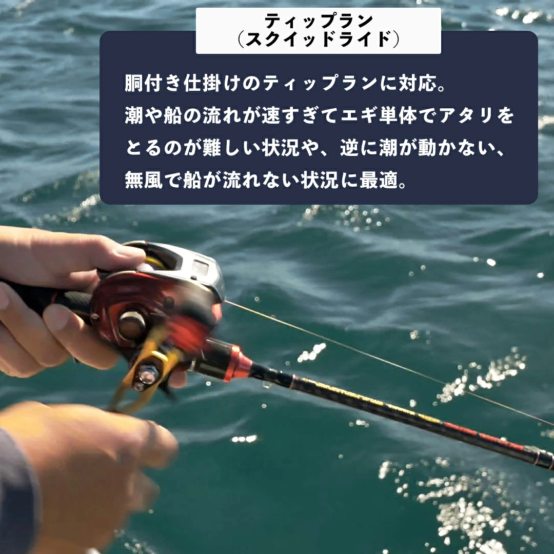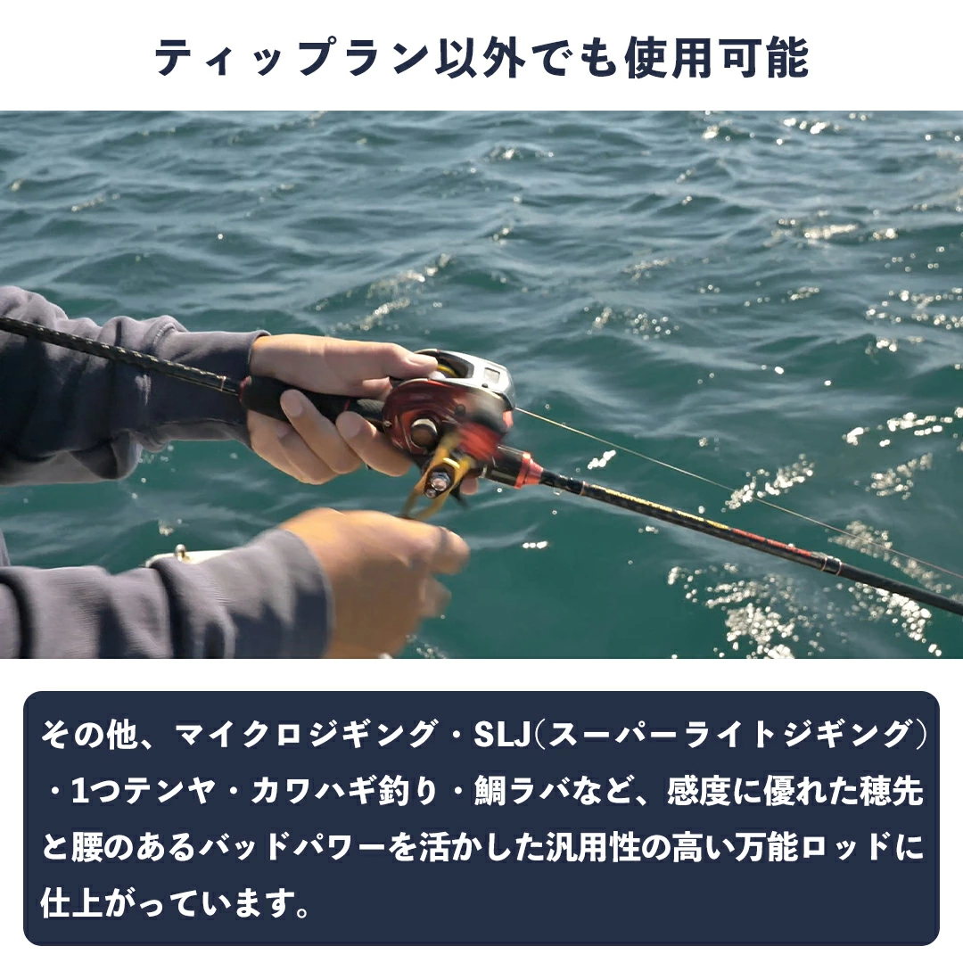 ティップランとイカメタル以外にも、スロージギング・鯛ラバ・マイクロジギング・1つテンヤ・カワハギ釣りとオールマイティーに使える万能ロッドとなっています。