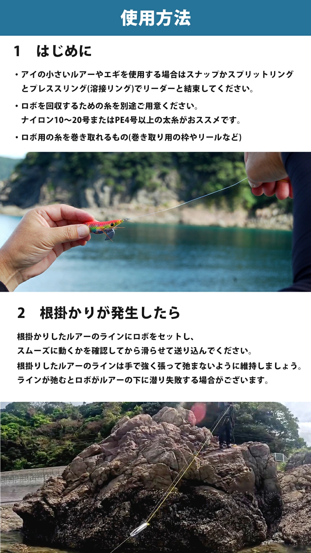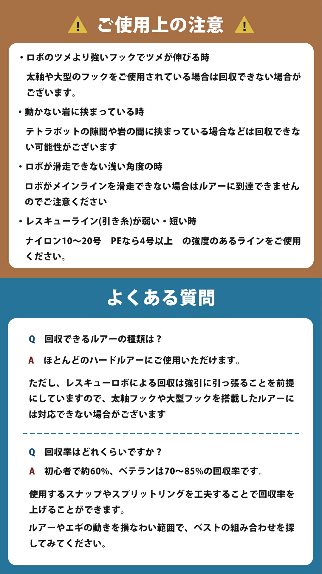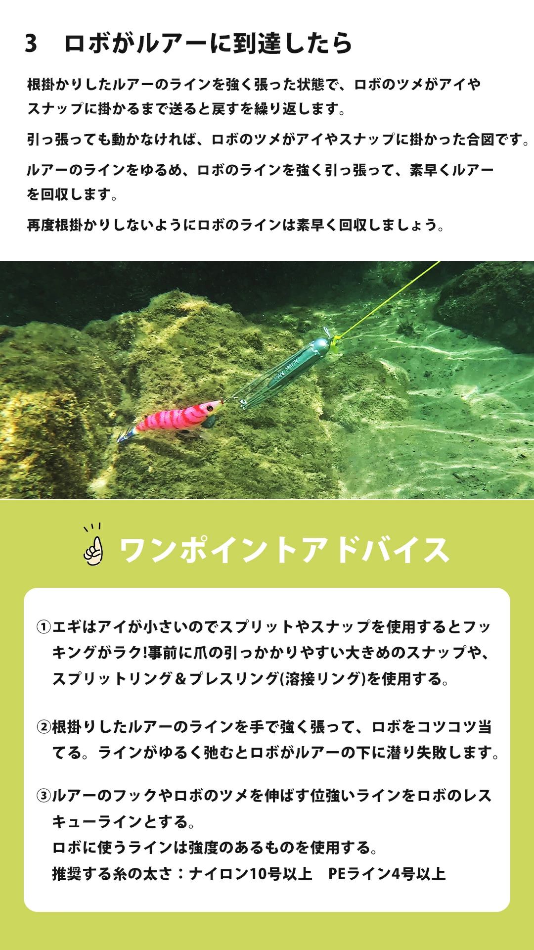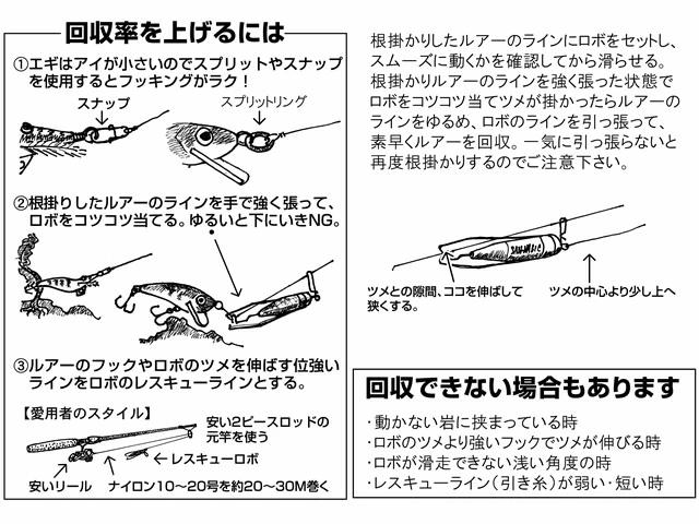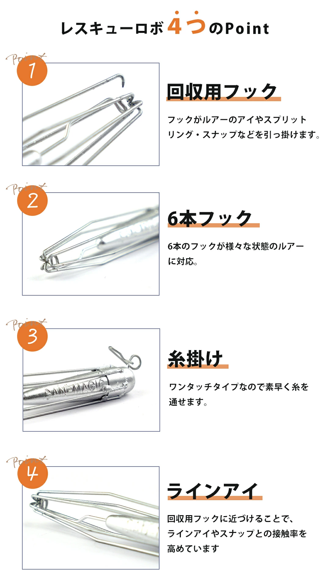 ●回収フックがスプリットリングやアイやスナップにがっちりアタック!フックを伸ばしてでも回収!●レスキューロボが滑走できる角度なら遠くの根掛りも回収できます。