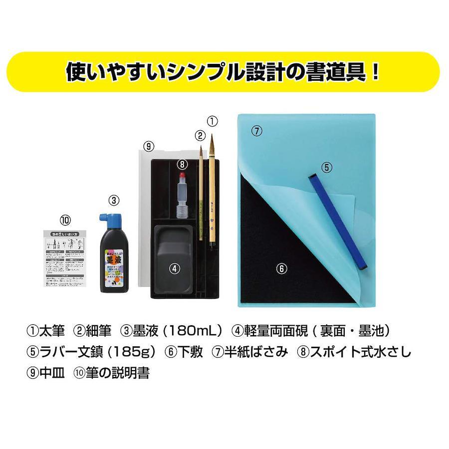 太筆、細筆、墨液(180mL)、軽量両面硯(表面:硯、裏面:墨池)、ラバー文鎮(185g)、下敷、半紙ばさみ、スポイト式水差し、書道具収納ケース、筆の説明書