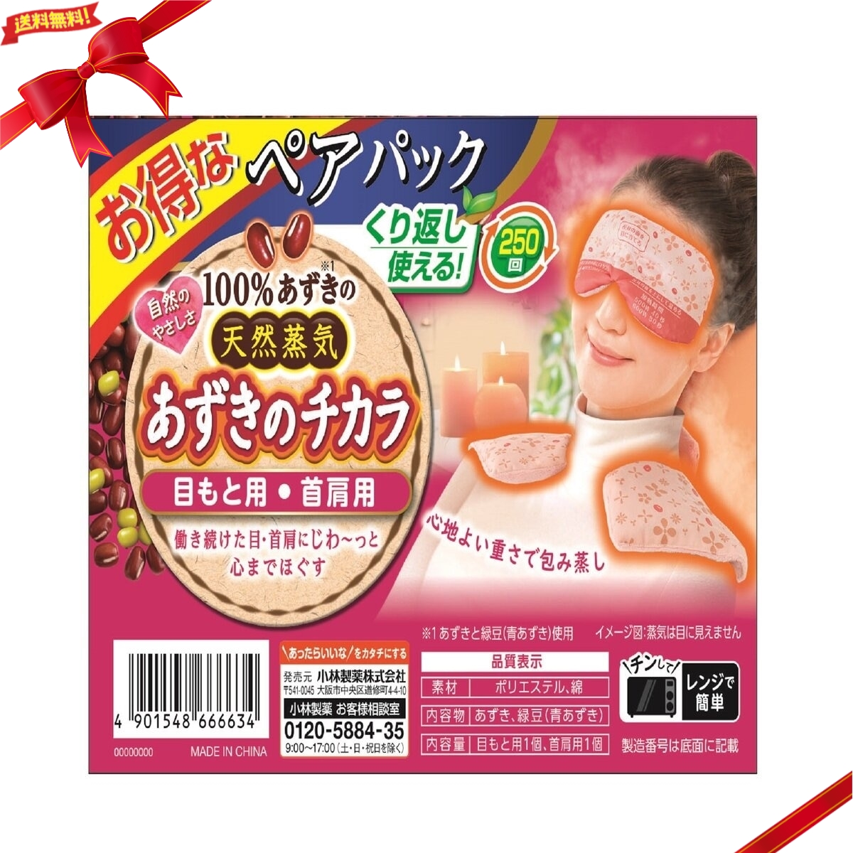 ・あずきのチカラ ペアパック・目もと用、首肩用 各1個入り・あずきで作られた蒸気※1温熱ピローです。レンジで温めて使用します。・あずきの天然蒸気※1の温熱で温め、心までほぐしていきます。・繰り返し250回(1日1回使用で約8ヵ月)使えるので経済的です。※1:蒸気は目に見えません。