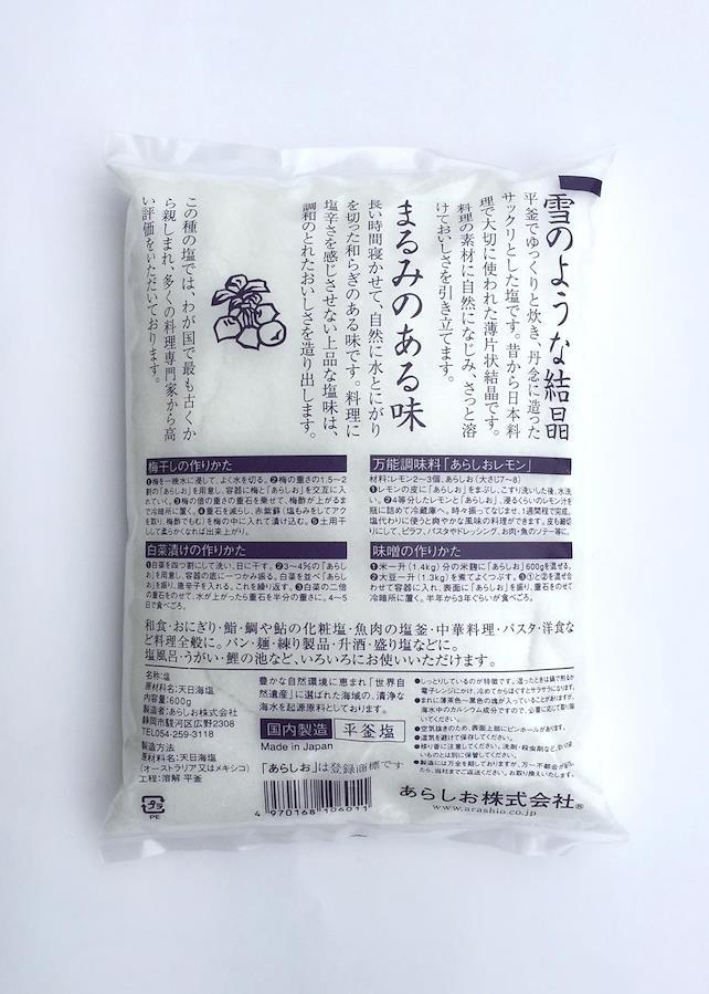 日本で最も古くから親しまれている平釜塩。「あらしお」は、釜でゆっくり炊き上げる手間ひまを惜しまない製法で作られた塩です。しっとり、ふんわりした手触りで、野菜や魚、肉になじみ、素材本来の味を際だてます。フレーク状の結晶は、料理の素材にさっとなじみ、浸透の早さに定評をいただいております。ゆったりと、時間をかけて自然に水とにがりを切った「あらしお」は、まるみのある味が特長。素材の味に、和らぎのある塩味が調和します。