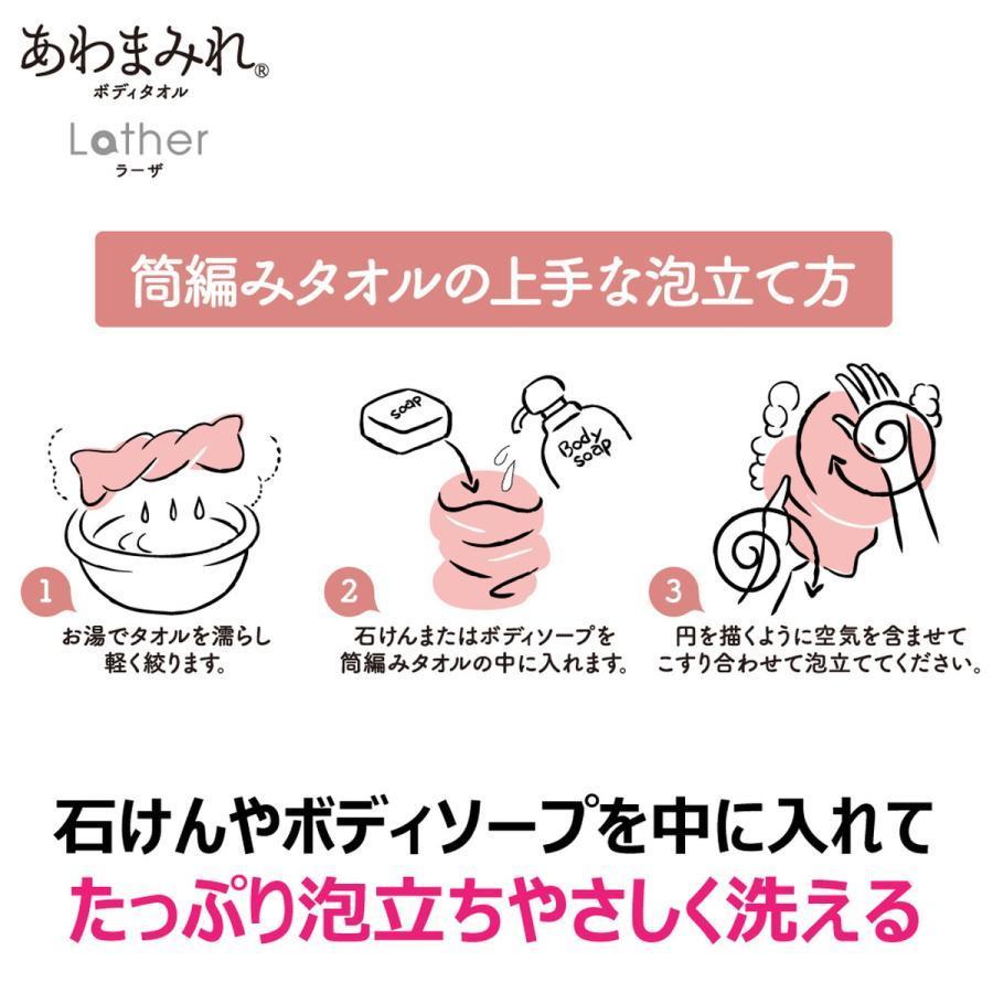 【上手な泡立て方】石けんまたはボディーソープを筒編みタオルの中に入れて泡立てることで、たっぷり泡立ちやさしく洗えます。(1)お湯でタオルを濡らし軽く絞ります。(2)石けんまたはボディーソープを筒編みタオルの中に入れます。(3)円を描くように空気を含ませてこすり合わせて泡立ててください。