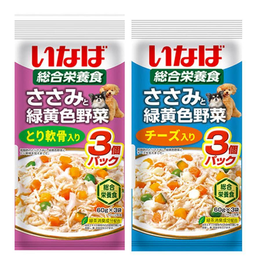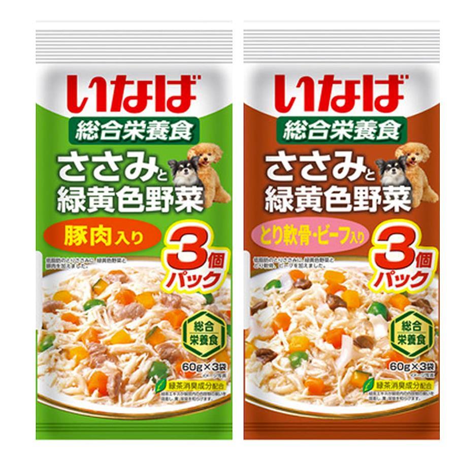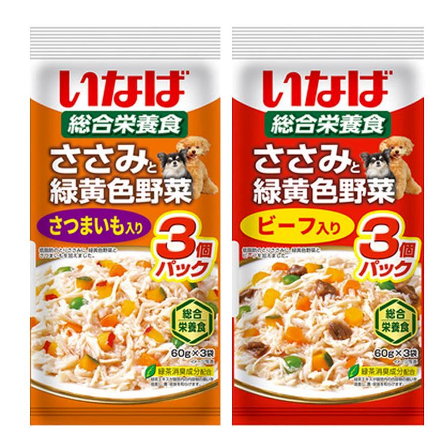 低脂肪のささみベースのレトルトパウチ。60g×3個パック。 ささみと緑黄色野菜(チーズ入り、豚肉入り、ビーフ入り、とり軟骨入り、さつまいも入り、とり軟骨ビーフ入り)