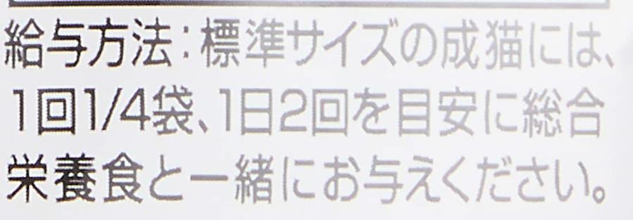 標準サイズの成猫には1回1/4袋、1日2回を目安に総合栄養食と一緒にお与えください。