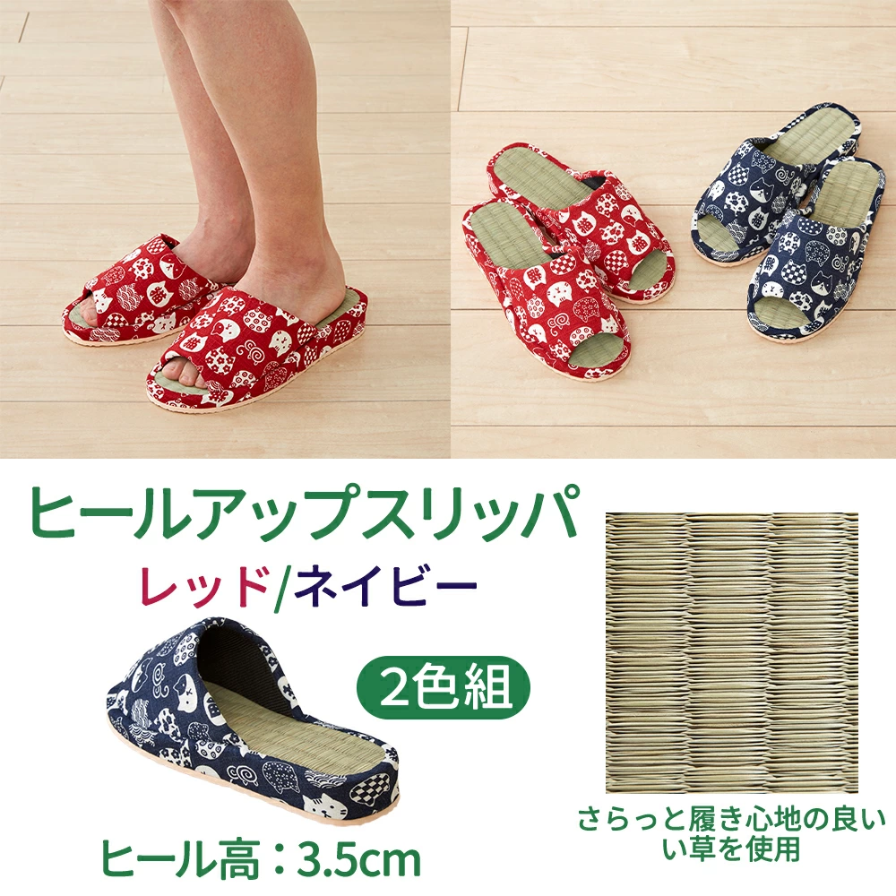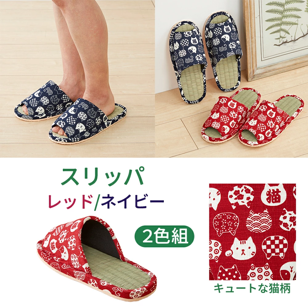【商品名(JAN)】い草スリッパ 福ねこ 2色組 XM-774(4968812420453)い草ヒールアップスリッパ 福ねこ 2色組 XM-775(4968812420460)【商品サイズ(約)】[スリッパ]全長:約26cmヒール高:約2cm適用サイズ:約22~26cm片足約75g[ヒールアップスリッパ]全長:約25cmヒール高:約3.5cm適用サイズ:約22~24cm片足約90g【材質】生地:ポリエステル中敷:い草中材・底材:EVA樹脂【製造国】中国【商品情報】さらっと履き心地の良いい草を使用。キュートなねこ柄の和風スリッパです。レッド系・ネイビー系の2色組。※洗えません。※柄の出方が異なります。