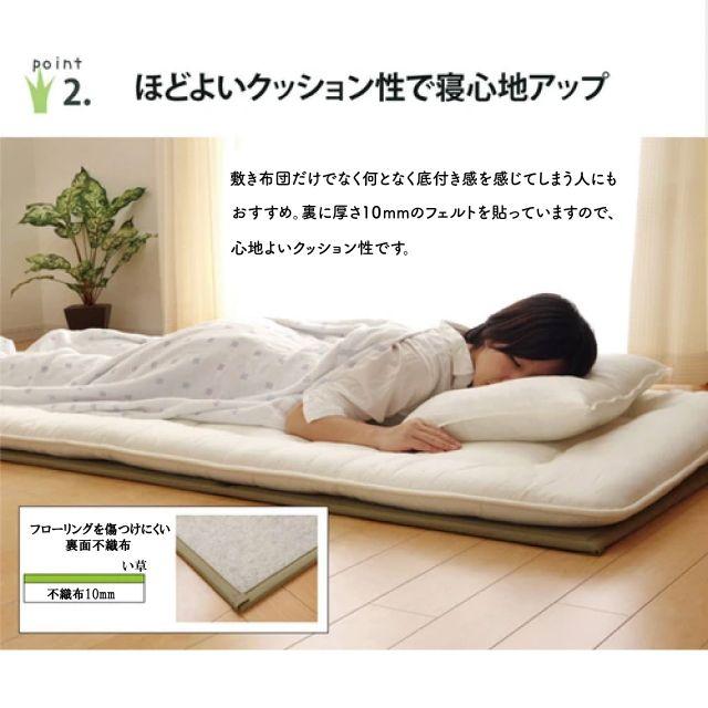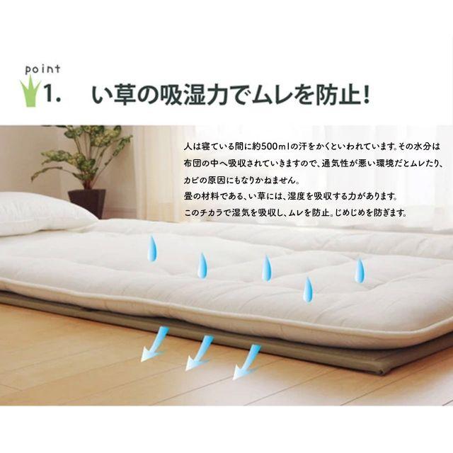 特徴い草には空気の自然浄化作用、湿度の調節作用などがあり、布団の下の湿度を調湿してくれます。