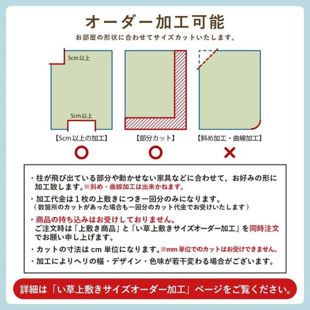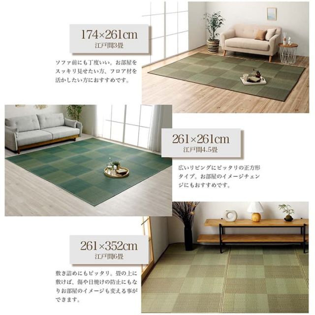 い草カーペットは和室の畳をカバーし、汚れや傷を防止してくれます。通常のカーペットと違い毛足が無いのでゴミや髪の毛などがからみにくく、掃除機やコロコロ(粘着シート)での掃除がラクにできます。い草には優れた消臭機能があり、汗臭やペット臭などの原因となる物質を消臭してくれます。い草には喘息の原因の一つとも言われる二酸化窒素や、シックハウス症候群の原因の一つのホルムアルデヒドを吸着してくれます。天然物質としては抗菌力の高い青森ヒバから抽出したヒノキチオールをい草生地に使用しており、抗菌防臭効果があります。い草の癒される香りとサラッとした肌触りはそのままに、和室や洋室にも合わせられるインテリア性の高いナチュラルシンプルなデザインで仕上げています。