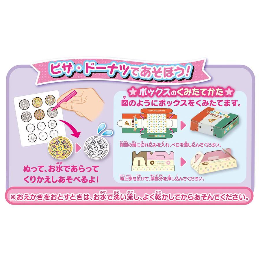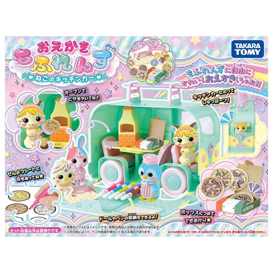 人気の「おえかき遊び」と「お人形遊び」の両方が楽しめる「おえかきもふれんず」!人気のねこと専用ペンに加えキッチンカー、ドーナツやピザなどの小物が入ったごっこあそびが楽しめる商品です。「おえかきもふれんず」は付属のドールに専用ペンで「おえかき」すると、お水で落としてくり返しおえかきすることができます。お気に入りのドールができたらキッチンカーでごっこあそびをたのしもう。付属のドーナツとピザに好きな味付け(おえかき)をしたらオーブンでやきあげてね。できあがったドーナツやピザをボックスに詰めたら、キッチンカーでドライブにしゅっぱつ!※キッチンカーはドールや専用ペン、小物などの収納としても使用できます。※ドーナツ・ピザは何度もくりかえしおえかきができます。