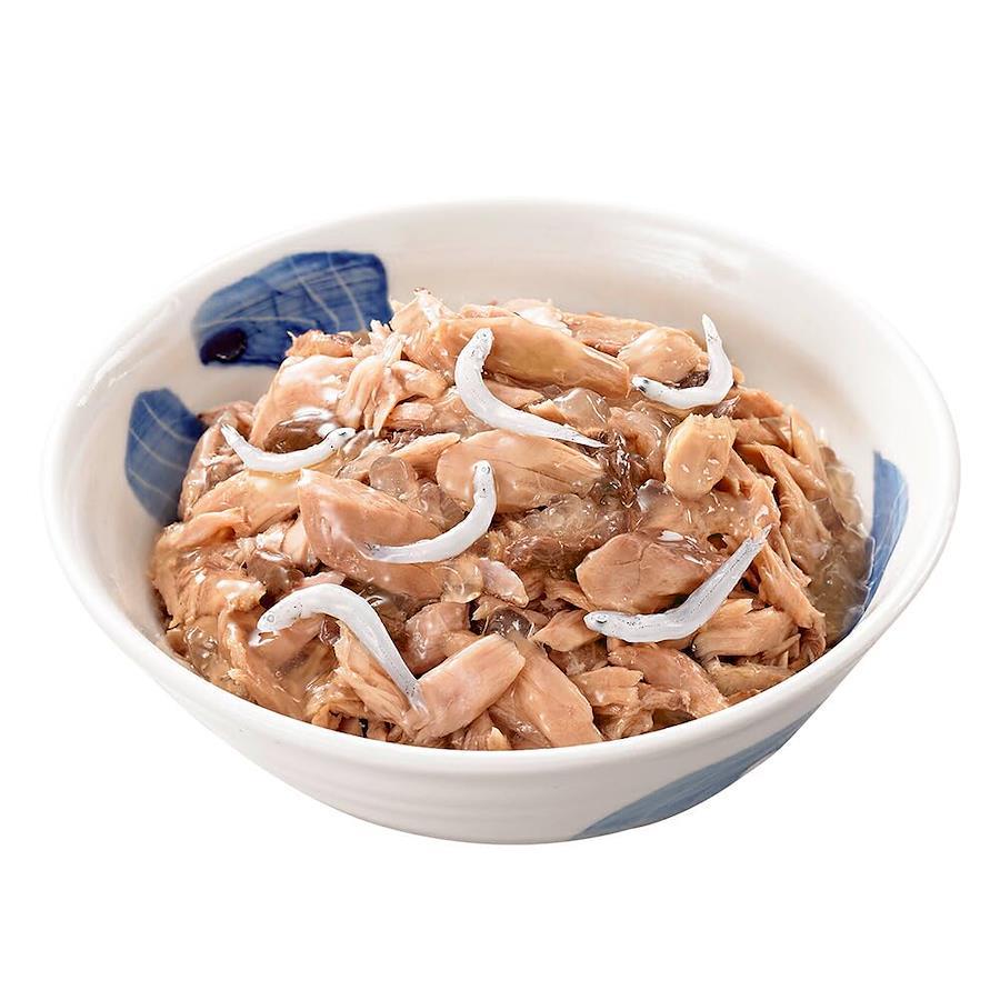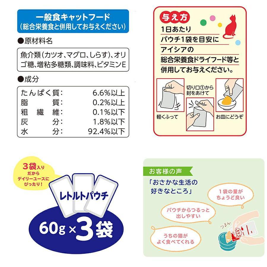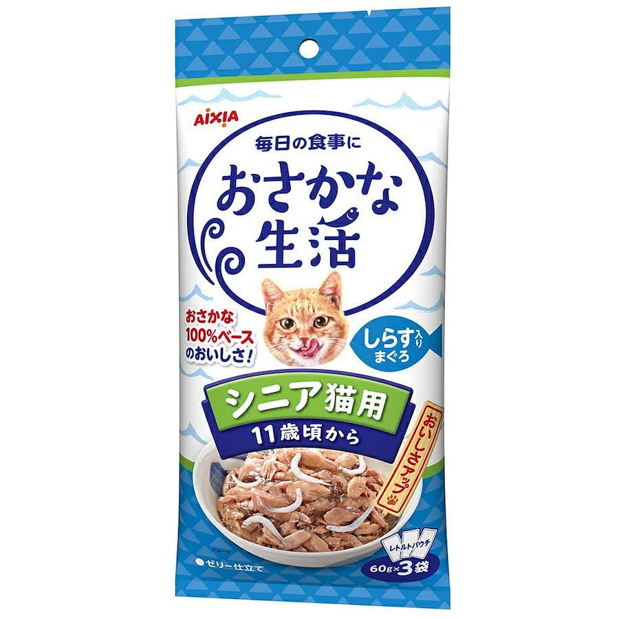 ベース素材はまじりっけなしのおさかな100%。おさかなのおいしさをとじこめたゼリー仕立てで、11歳頃からのシニア猫の健康維持に配慮し、ビタミンEと腸内の善玉菌を増やすオリゴ糖を調整。3袋入り。