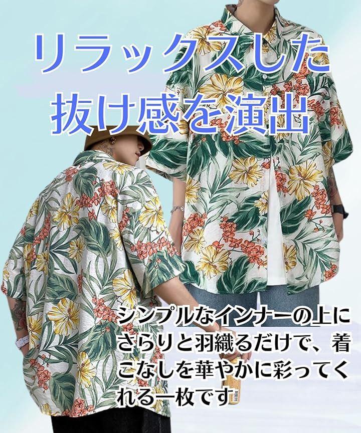カラーバランスが絶妙なアロハ柄テイストの総柄デザインが夏のファッションを彩ってくれます デザインの違いで雰囲気も変わるので、何枚持っていても困らないアイテムです。