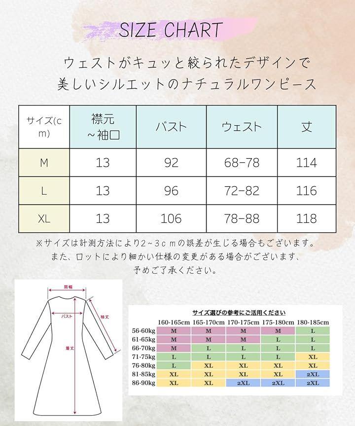 「サイズ」M・L・XL 「M」襟元~袖口13/バスト92/ウエスト68-78/丈114 「L」襟元~袖口13/バスト96/ウエスト72-82/丈116 「XL」襟元~袖口13/バスト106/ウエスト78-88/丈118