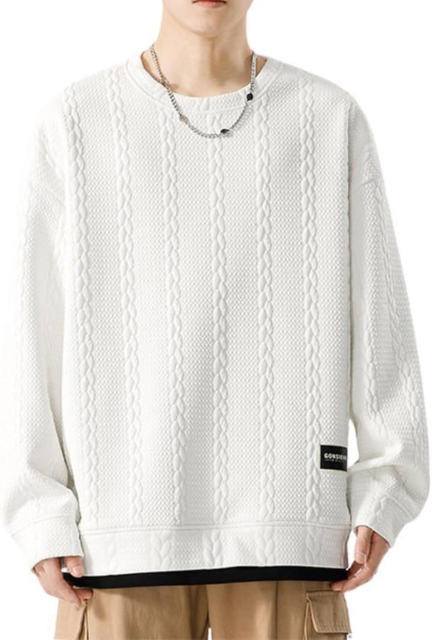 襟元と裾がレイヤード風になっているフェイクレイヤードデザイントレーナー ニットのようなケーブル編みの凹凸があるエンボス素材なのでこなれ感のある大人なカジュアルスタイルにオススメのメンズ長袖トレーナー。