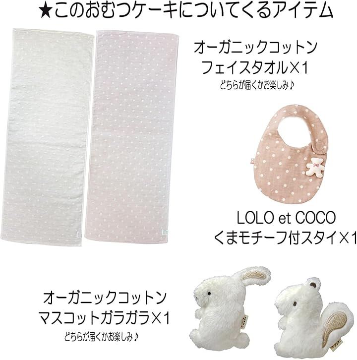 このおむつケーキには、赤ちゃんの敏感な肌にやさしいオーガニックコットンのスタイと、赤ちゃんが安心して遊べるオーガニック素材のガラガラが付いています。