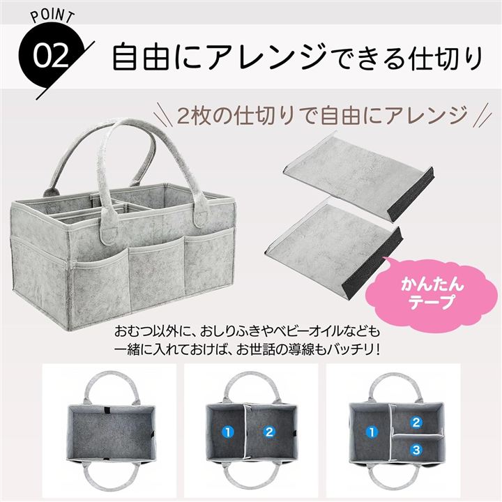 」 丈夫なハンドル付きで、リビングから寝室へ、寝室からお風呂場へと、お世話セット一式をまるごと手軽に持ち運び。