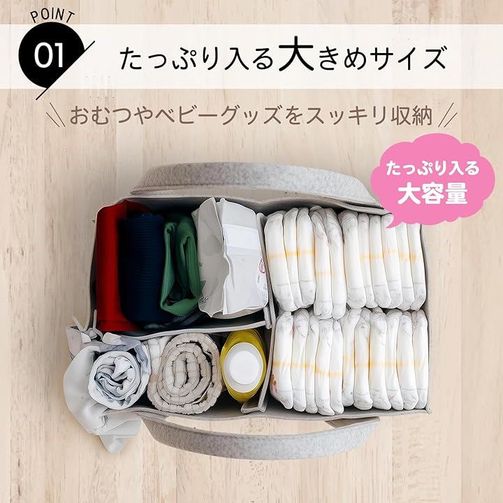 おむつ、おしりふき、肌着、綿棒、爪切り…赤ちゃんのお世話に必要なグッズを、すべてまとめて収納できます。