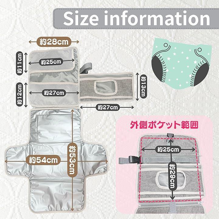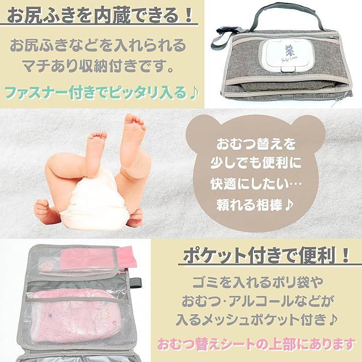 「おむつ替えシート付き」ファスナーで脱着可能な、クッション入りのおむつ替えシートが付いていて便利。