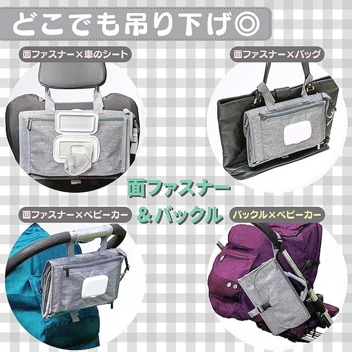 「車に吊り下げ可能」2way面ファスナーで、車のシートやベビーカーにも取り付けられる便利なおむつポーチ。