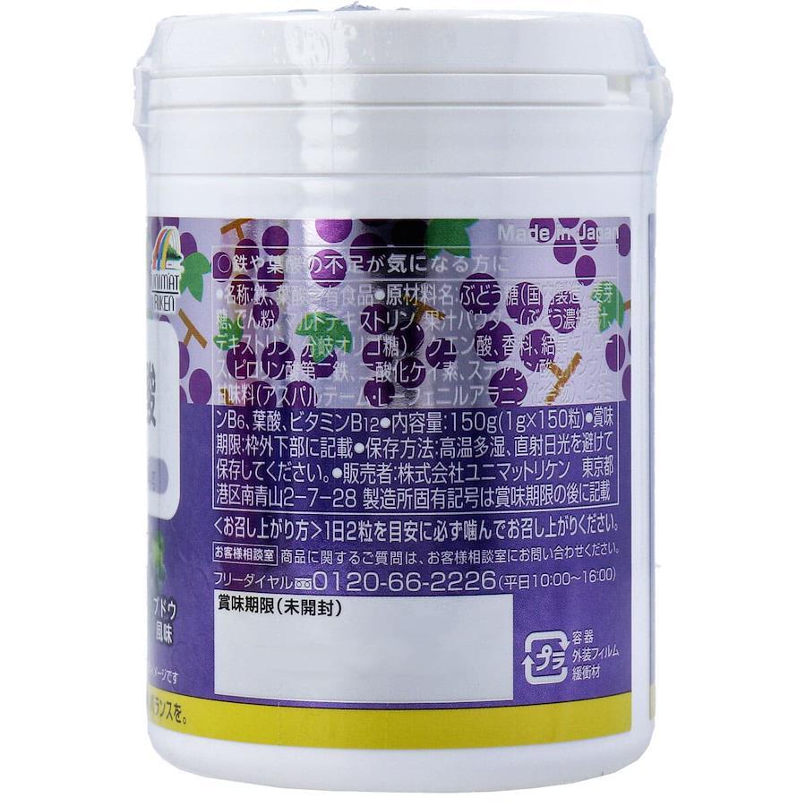 【原材料】ぶどう糖(国内製造)、麦芽糖、でん粉、マルトデキストリン、ぶどう果汁パウダー(ぶどう濃縮果汁、デキストリン、分岐オリゴ糖)/クエン酸、香料、結晶セルロース、ピロリン酸第二鉄、二酸化ケイ素、ステアリン酸カルシウム、甘味料(アスパルテーム・L-フェニルアラニン化合物)、ビタミンB6、葉酸、ビタミンB12