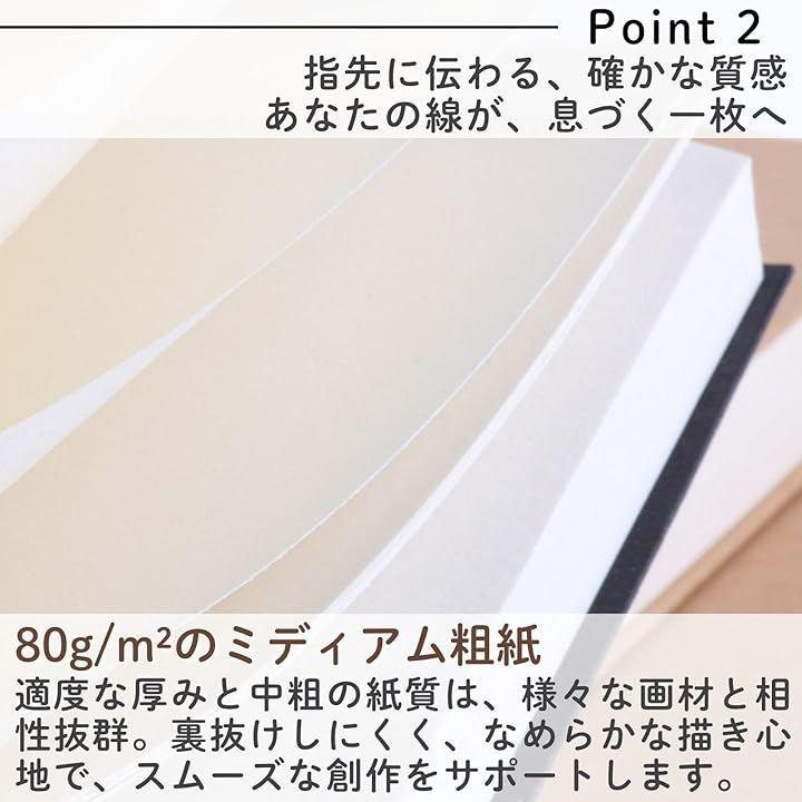 「80g/m2のミディアム粗紙」ペンや鉛筆に適した厚みと質感で、書き心地が良い。