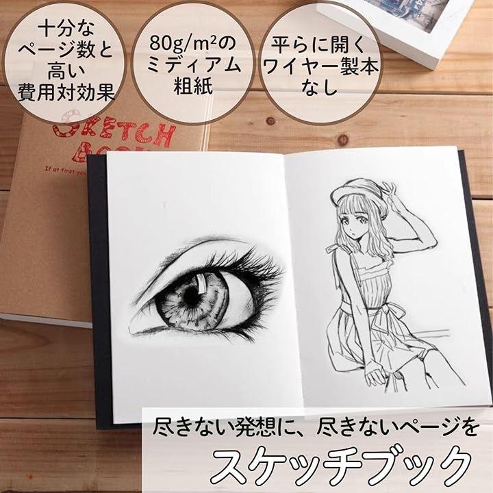 「平らに開くワイヤー製本なし」紙の接合部が邪魔にならず、ページを平らに開けるため、スムーズに描きやすい。