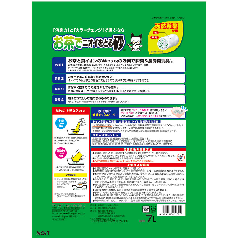 ・天然茶葉と銅イオンのWの消臭効果で、オシッコやウンチのニオイをすばやく消臭。・銅イオンの消臭・抗菌力で、イヤなニオイの発生を抑え、消臭効果が長続き。・オシッコでぬれた部分が緑色にカラーチェンジ。・スピーディーに固まり、汚れた部分は簡単に燃えるゴミとして捨てられます。・紙製なのでラクに持ち運べます。