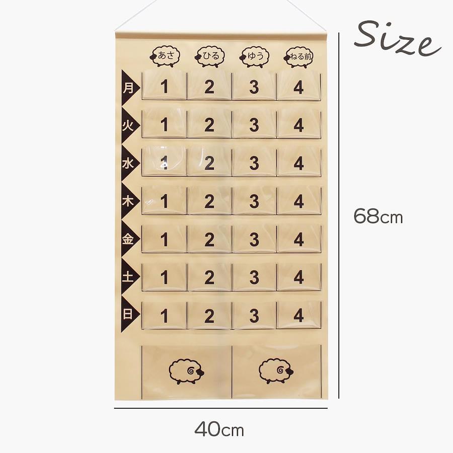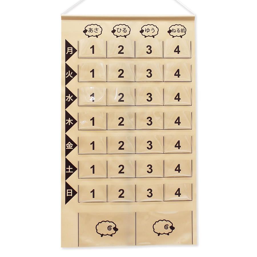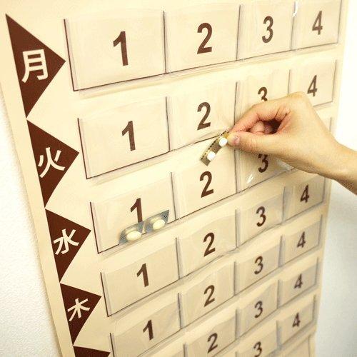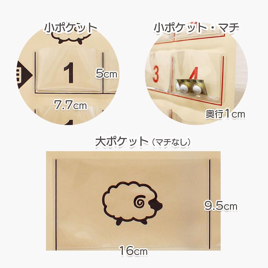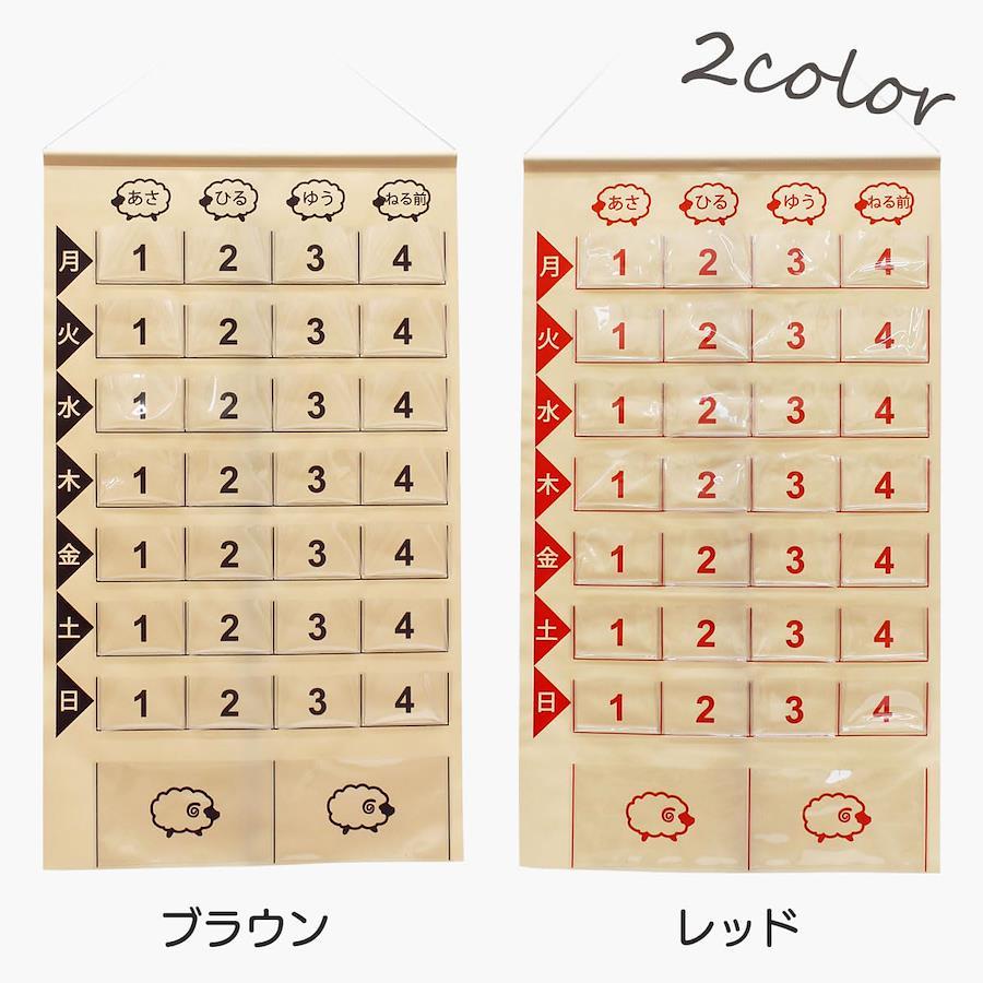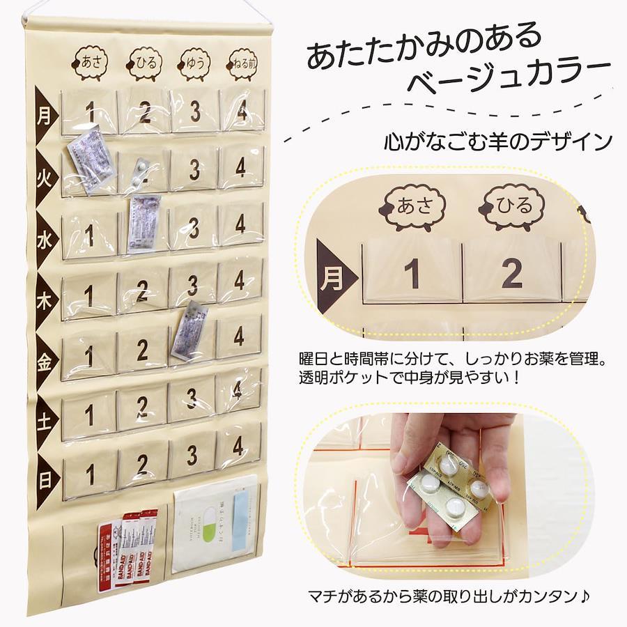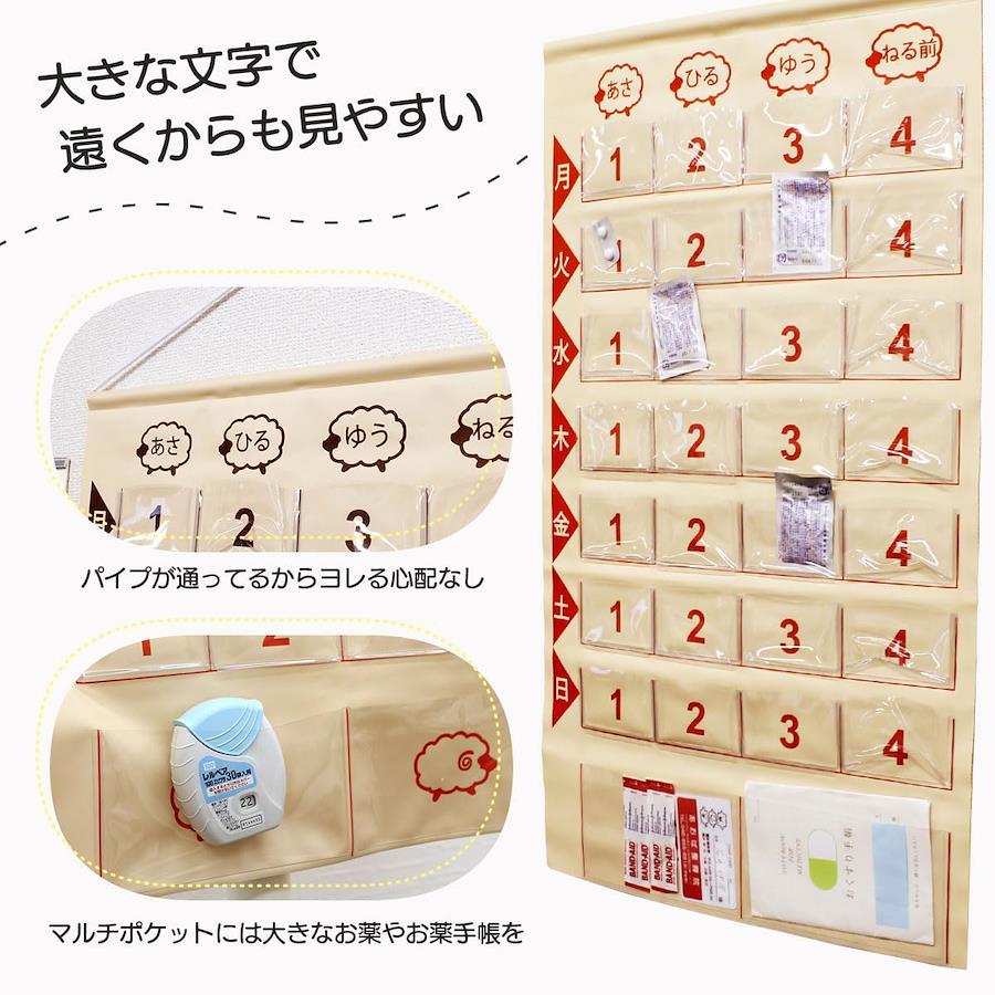 規格:投薬カレンダー1週間分ひつじ カラー:ブラウン/レッド サイズ:展開時:縦67×横39.5cm (ポケットサイズ/ポケット【小】縦5cm×横7.7cm[マチ約1cm]、ポケット【大】/縦9.5cm×横16cm[マチなし]) 仕様:ポケット【小】/4×7(合計28ポケット)、ポケット【大】/2ポケット 素材:本体:塩化ビニール、ひも(アクリル)、パイプ(硬質塩化ビニール) 重量:200g 生産国:日本製 made in Japan