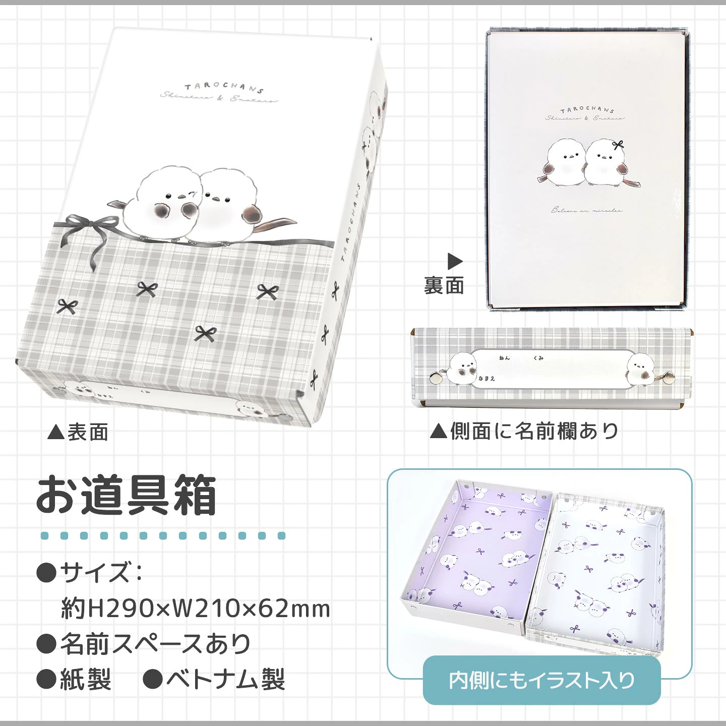 ■セット内容・お道具箱:約H290×W210×D62mm、名前スペース付き、紙製、ベトナム製・両面ペンケース:約H85×W220×D30mm、ランドセルに入れやすい薄型スリム、中国製・ダース鉛筆:1本約Φ7.5×H178mm、2B丸軸黒鉛筆11本、丸軸赤鉛筆1本、日本製・消しゴム:約H45×W25×D14mm、まとまるくん、無香料、日本製・17cm定規:約H20×W180mm、スリムタイプ、ラメ入りクリア、中国製・鉛筆キャップ:パッケージサイズ約H80×W60mm、入数5本、名前スペース付き、日本製・マイネームなまえペン:約Φ12×H140mm、ツインタイプ、油性/黒、日本製・水のり:約Φ30×H113mm、香り付き、塗り口はスポンジタイプ、名前スペース付き、台湾製・色鉛筆(12色):約H180×W100×D13mm、名前スペース付き缶ケース入り、スリムタイプ、中国製・はさみ:約H145×W60×D6mm、ソフトグリップ、ネームタグ付き、安全キャップ付き、中国製・きれいに切り離せる自由帳:B5サイズ、中紙/28枚、白無地、名前スペース付き、日本製・下じき:B5サイズ、クリア、日本製