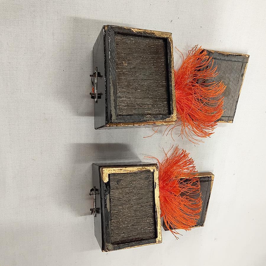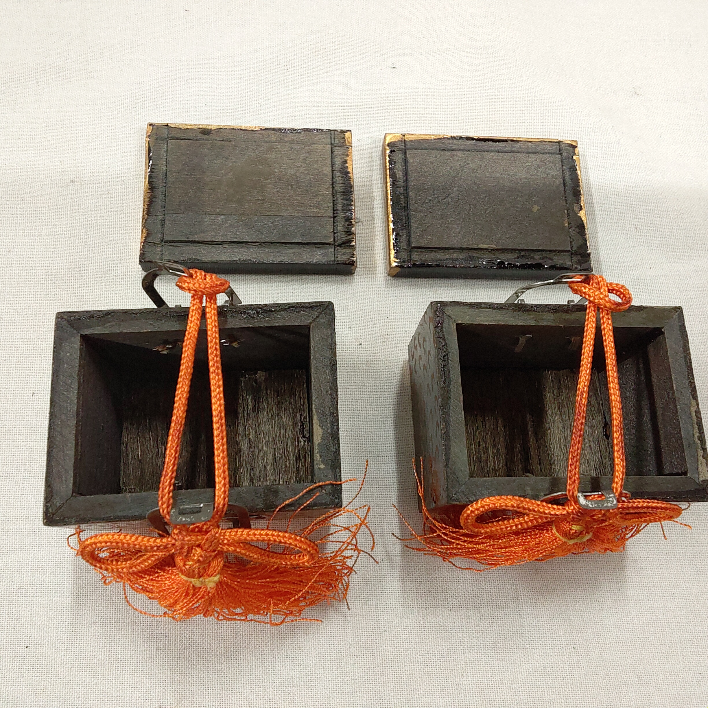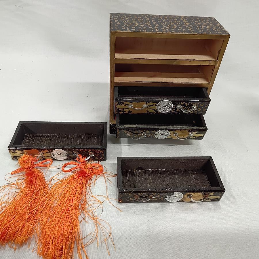 お雛道具 嫁入り道具 タンス・長持のミニチュア です。木製で細工がきれいです。インテリアや小物入れ等色々な使い方があるかもしれません。うらがわやタンスの引き出しの中等、塗りが荒いです。長期保管によりオレンジ色の房等経年劣化しています。