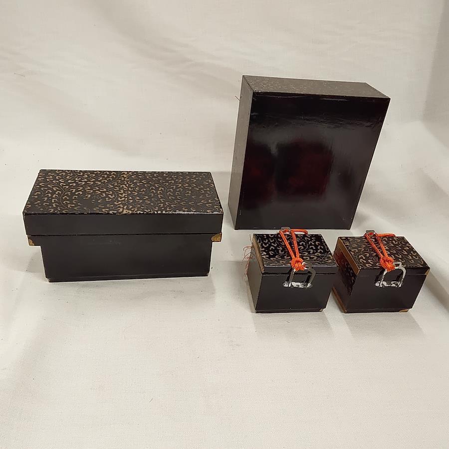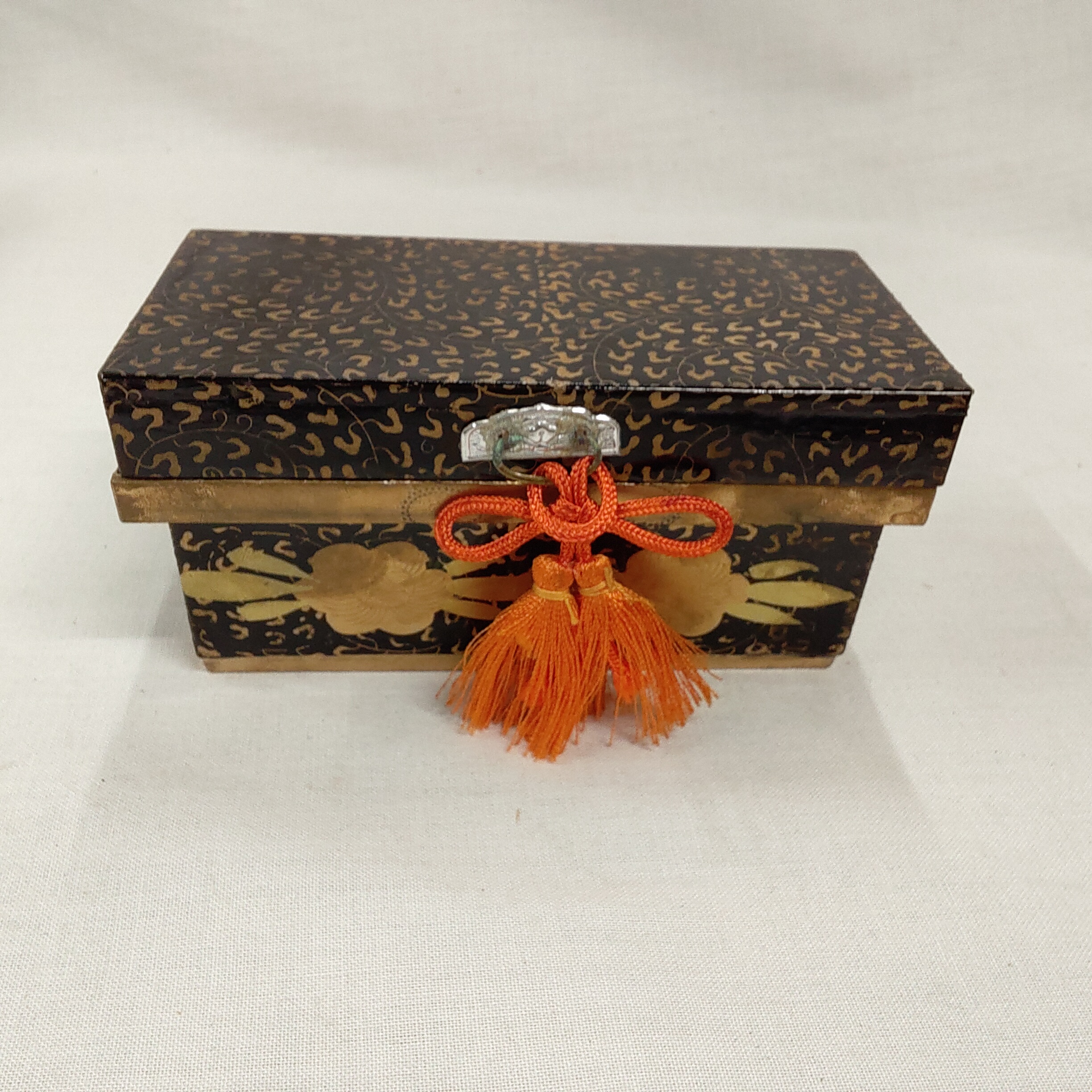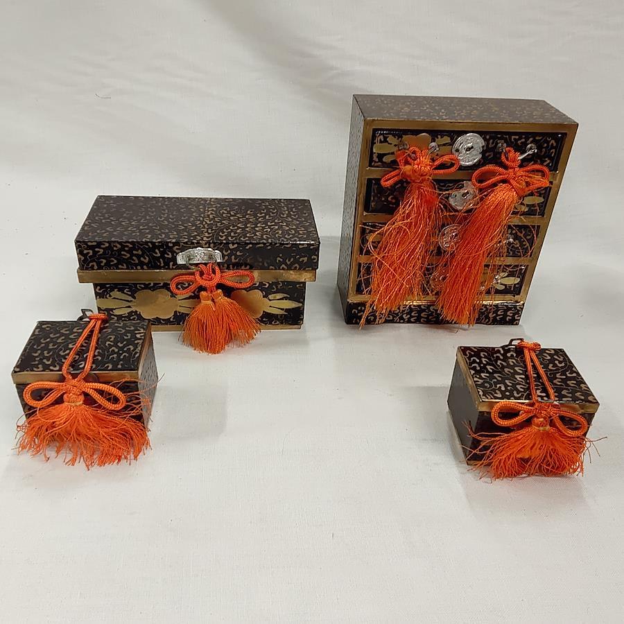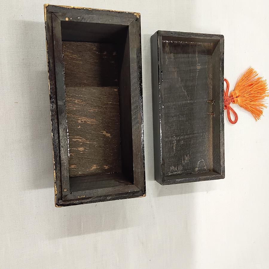 お雛道具 嫁入り道具 タンス・長持のミニチュア です。木製で細工がきれいです。インテリアや小物入れ等色々な使い方があるかもしれません。うらがわやタンスの引き出しの中等、塗りが荒いです。長期保管によりオレンジ色の房等経年劣化しています。