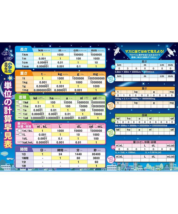 お風呂で楽しく単位計算学習:単位計算が苦手な子供向けの教材で、お風呂時間を有効活用し、効果的に学習ができる早見表ポスター。 独自の星空デザイン:リラックス効果が期待できる美しい星空デザインで、子供たちが集中して学習に取り組むことができます。 簡単計算マス付き:親子で楽しく学べる、当てはめるだけで単位計算ができる独自のマス付き設計で、計算力の向上をサポート。 防水&リユーザブル素材:耐水性の高いユポ紙を使用したポスターで、お風呂場で繰り返し使えるリユーザブルデザイン。 お子様への最適なギフト:勉強が苦手な子供への誕生日や入学祝いなどのギフトにも最適で、親子で楽しめる新しい学習方法。