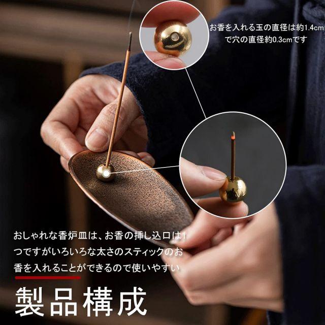 【製品構成】おしゃれな香炉皿は、お香の挿し込口は1つですがいろいろな太さのスティックのお香を入れることができるので使いやすい。使いやすくて壊れにくいお香立てです。お香を入れる玉の直径は約1.4cmで穴の直径約0.3cmです。