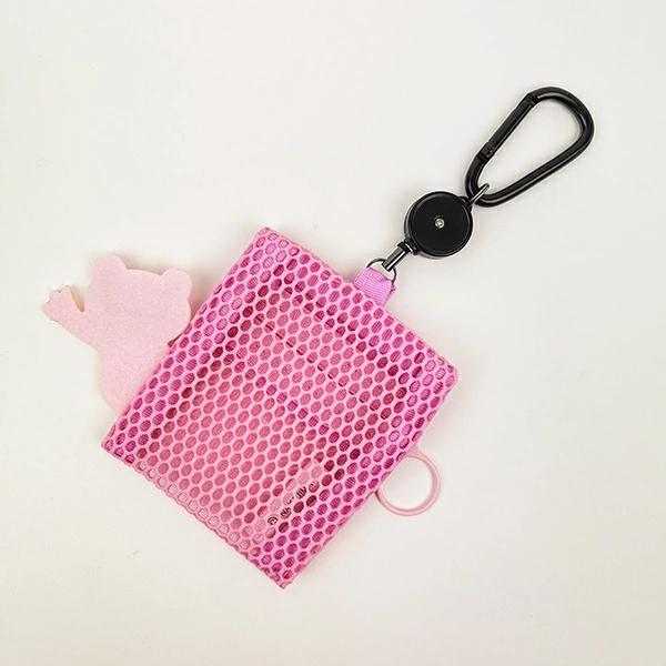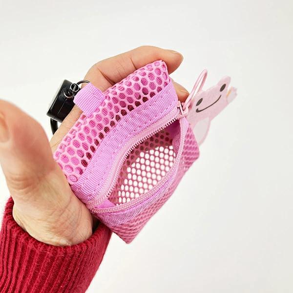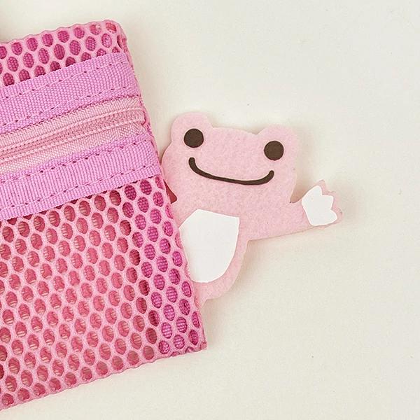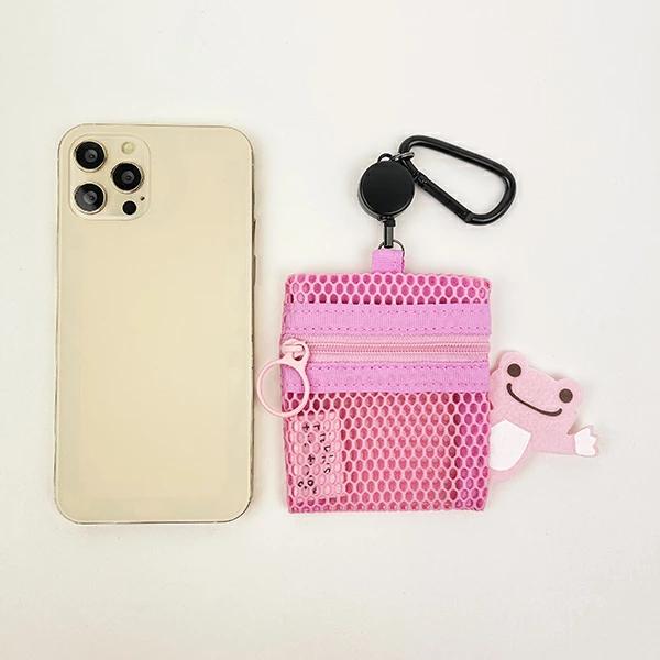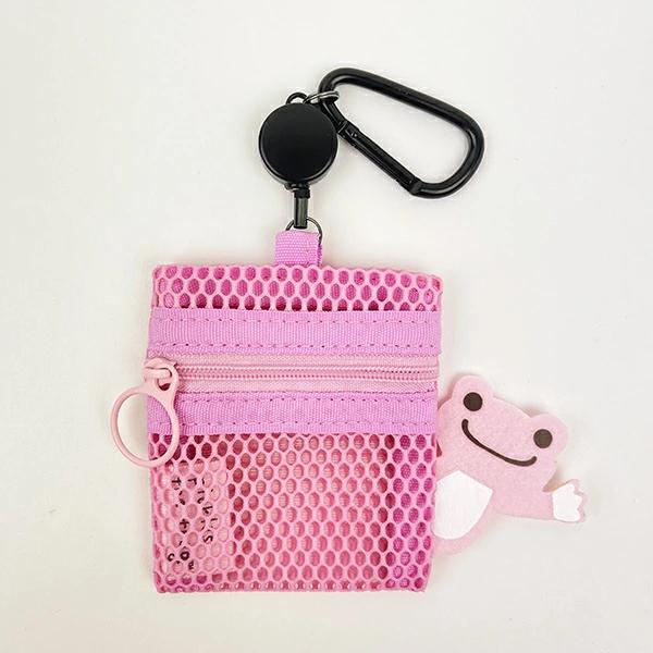かえるのピクルスのメッシュポーチです。リール付きなのでバッグなどに付けられます!リップやイヤフォンなどの小物を入れるのにぴったりなサイズ感☆メッシュで中身も確認しやすいのが嬉しいポイントです♪