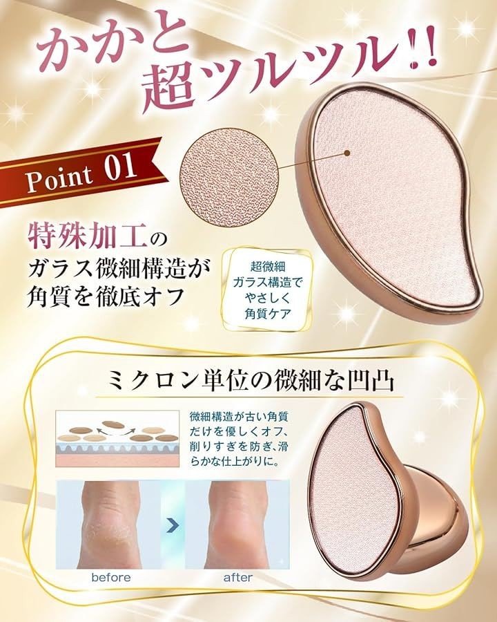 「ガラス微細構造でやさしく角質ケア」 ガラスの微細構造が角質に均一にアプローチし、削りすぎに配慮しながらなめらかな仕上がりへ導きます。