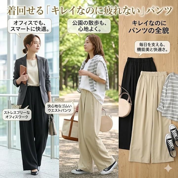 「着回せる「キレイなのに疲れない」パンツ」ウエストゴムとハイウエスト効果で着痩せと体型カバー